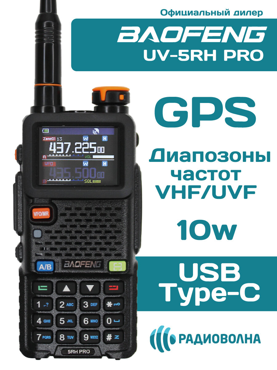 Купить Рация Baofeng UV-5RH PRO 10W GPS большой цветной дисплей зарядка от USB Type-C с доставкой по всей России.