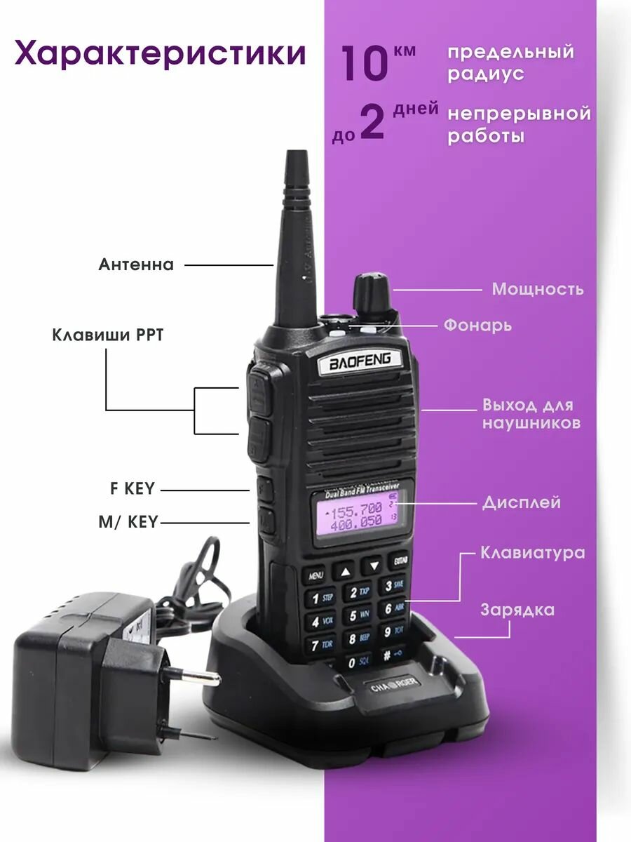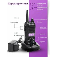 | Функции | Двухдиапазонный прием (VHF/UHF), сканирование частот, FM-радио, функция VOX (голосовое управление), сигналы тревоги, программируемые каналы, кодирование CTCSS/DCS, регулировка мощности передачи (Low/High), подсветка дисплея, долгий срок службы батареи, подключение к компьютеру для программирования. |