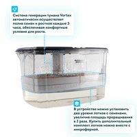 - Особенности: Полив осуществляется при помощи генератора тумана; Автономный "полив"; таймер; подсветка; Доп. лотки и надстройка