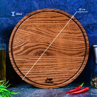 Круглая деревянная разделочная доска для кухни изготовлена из дуба и имеет диаметр 25 см, с желобками для сока по краям.
