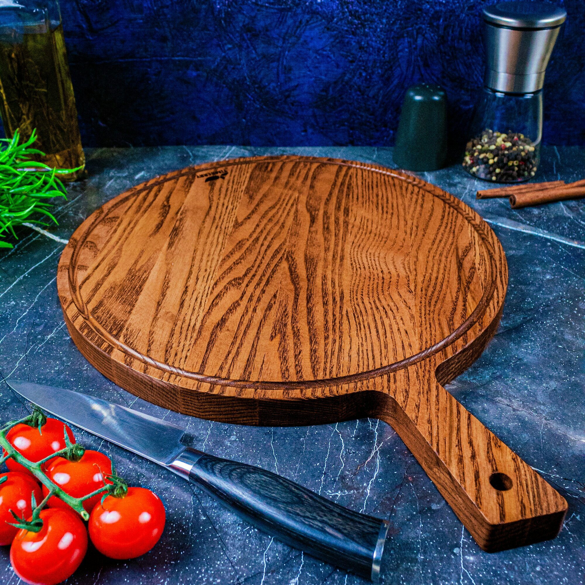 Разделочная доска деревянная круглая 30 см из дуба с ручкой