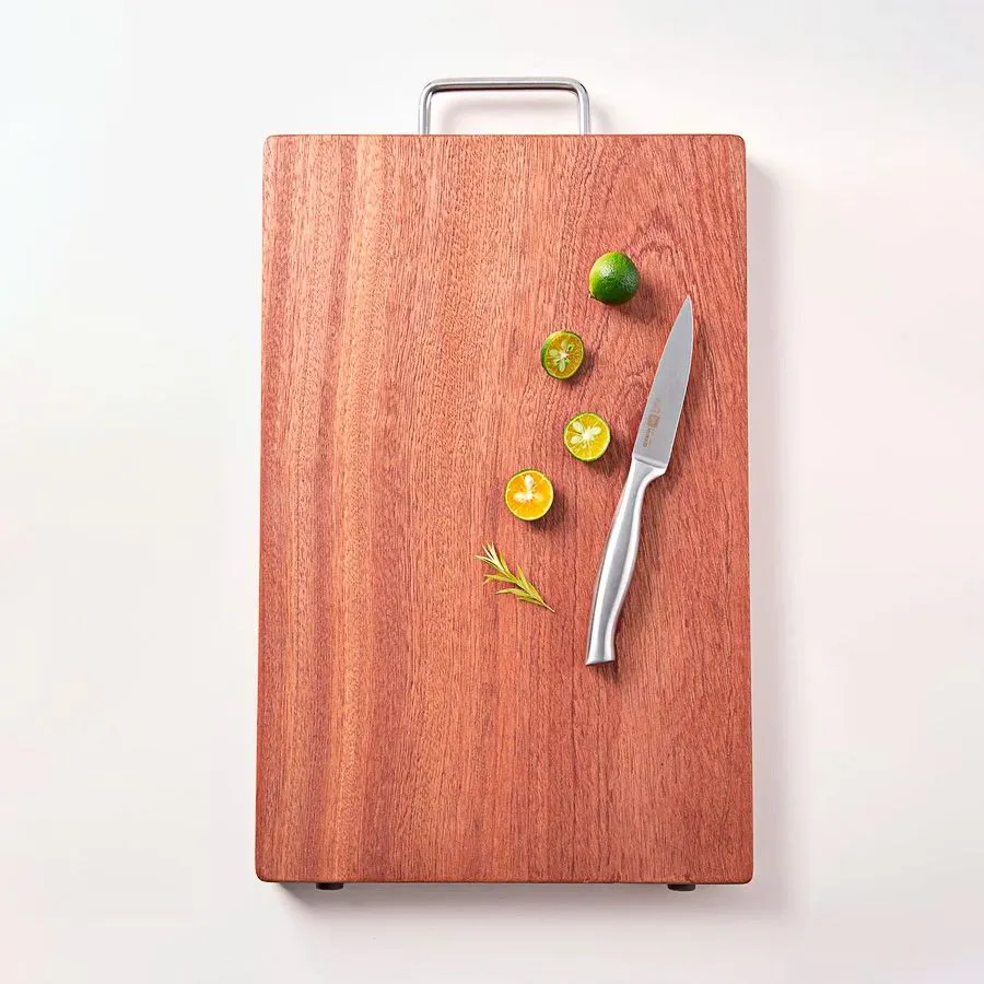Представляем вашему вниманию разделочную доску из дерева сапеле с желобком и металлической ручкой. Эта стильная и функциональная доска станет незаменимым помощником на вашей кухне. Изготовленная из высококачественного дерева, она отличается прочностью и долговечностью, что делает её идеальной для повседневного использования.
