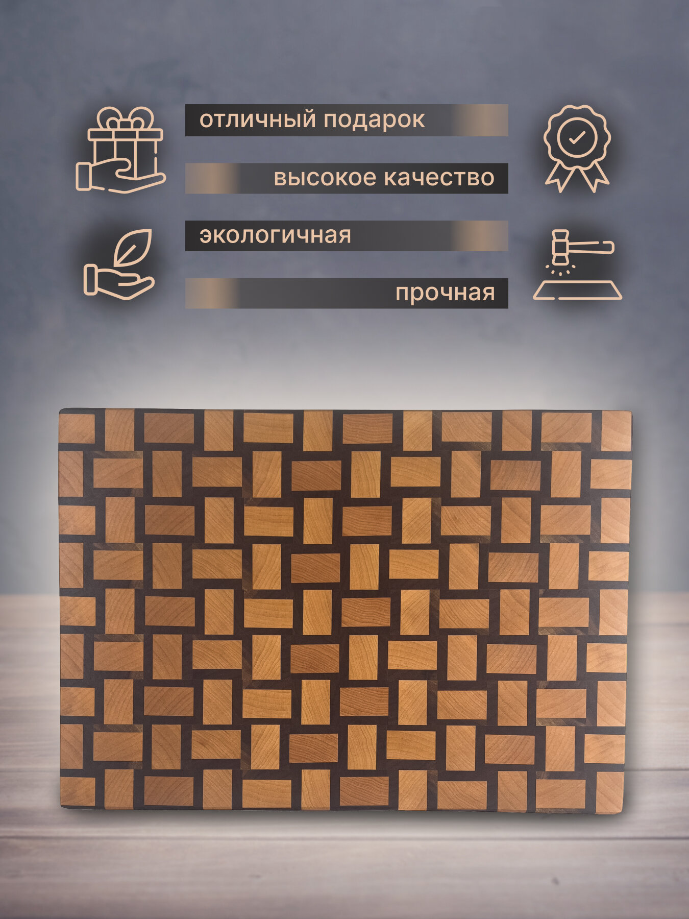 Торцевая разделочная доска выполнена из качественного дерева, пропитана минеральным маслом и покрыта воском. Обладает повышенной прочностью, экологичная, натуральная. Доска оснащена силиконовыми противоскользящими ножками, они способствуют хорошему проветриванию и защите от излишнего намокания. Доска может использоваться для резки продуктов, и для подачи и сервировки мяса, рыбы, сыра, пиццы, бургеров. Украсит вашу кухню и дом. Порадует вас на пикнике, барбекю. Время от времени смазывайте доску минеральным маслом, можно использовать смесь минерального масла с добавлением пчелиного воска (5/1). Нельзя мыть в посудомоечной машине и замачивать в воде. После мытья протирать сухим полотенцем. Избегать перепадов температур, хранить вдали от нагревательных приборов. Такие доски любят профессиональные повара и рестораны и кафе для красивой подачи блюд. Надеемся для вас это будет полезным и удобным приобретением. Все изделия сделаны вручную, рисунок, цвет, размер каждой доски может немного отличаться.