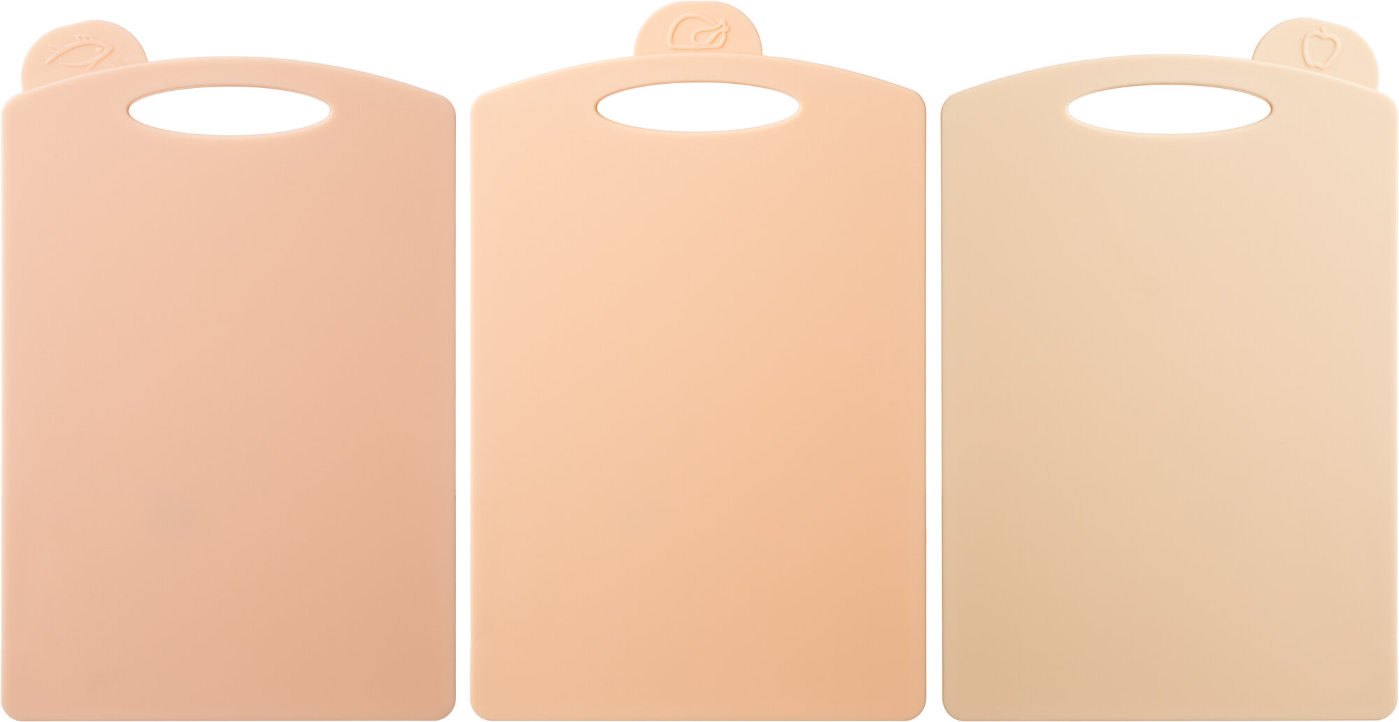 Доски имеют прямоугольную форму и разные цвета - бежевый, розовый и коричневый. Это позволяет использовать каждую доску для разделки разных продуктов, не путая их.