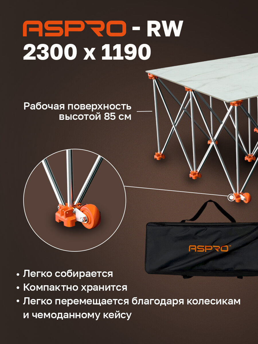 ASPRO RW - складной стол размером 230x119 см для специалистов разных областей, включая укладку плитки. Прочное алюминиевое основание с надежными опорами весит 15.5 кг и выдерживает нагрузку до 1 тонны. Рабочая поверхность высотой 85 см легко собирается, компактно хранится и перемещается благодаря колесикам и чемоданному кейсу. При резке плитки можно использовать стол как рабочую поверхность, для более широкого спектра применения - установите на его фанеру или OSB плиту.