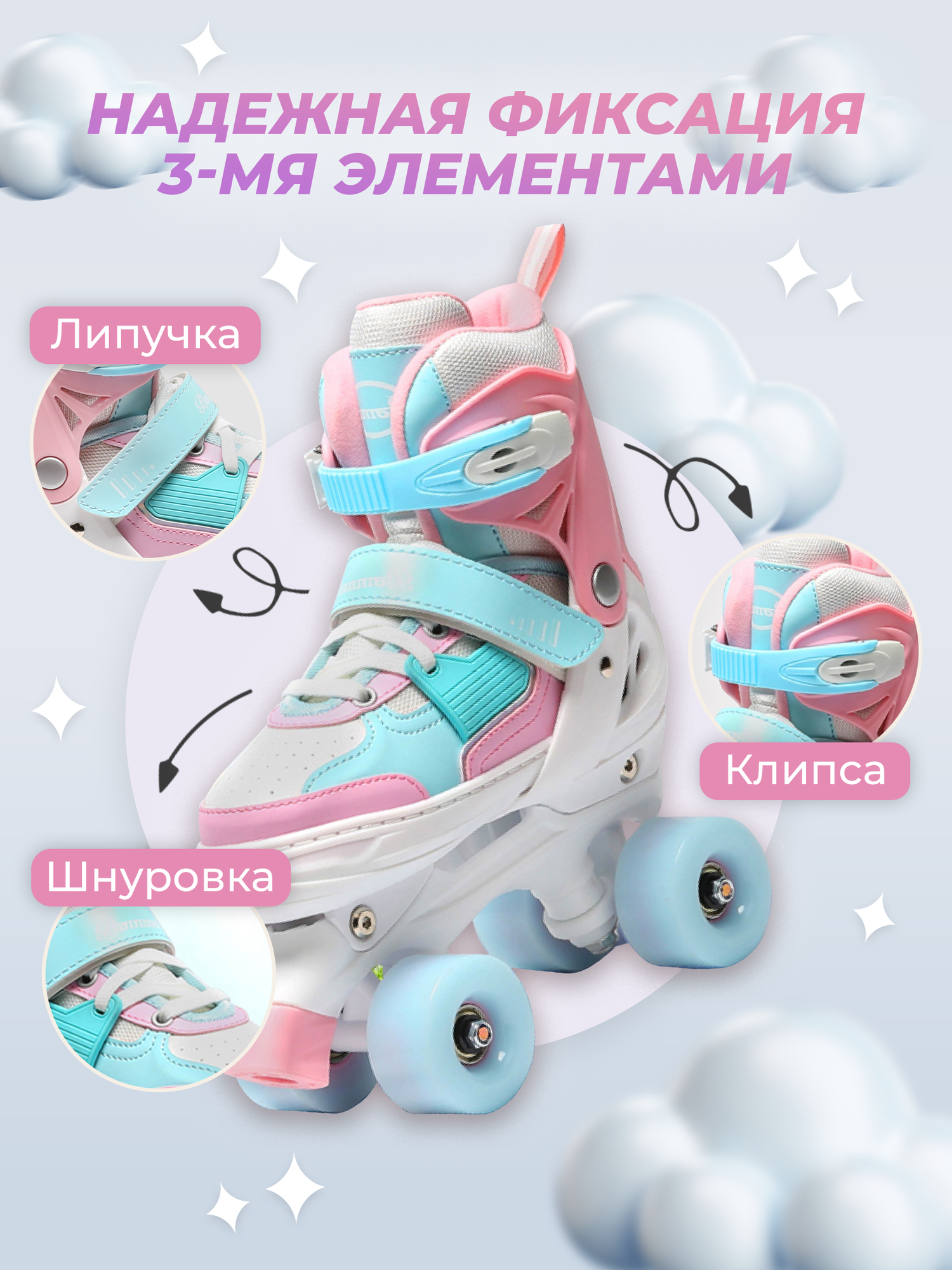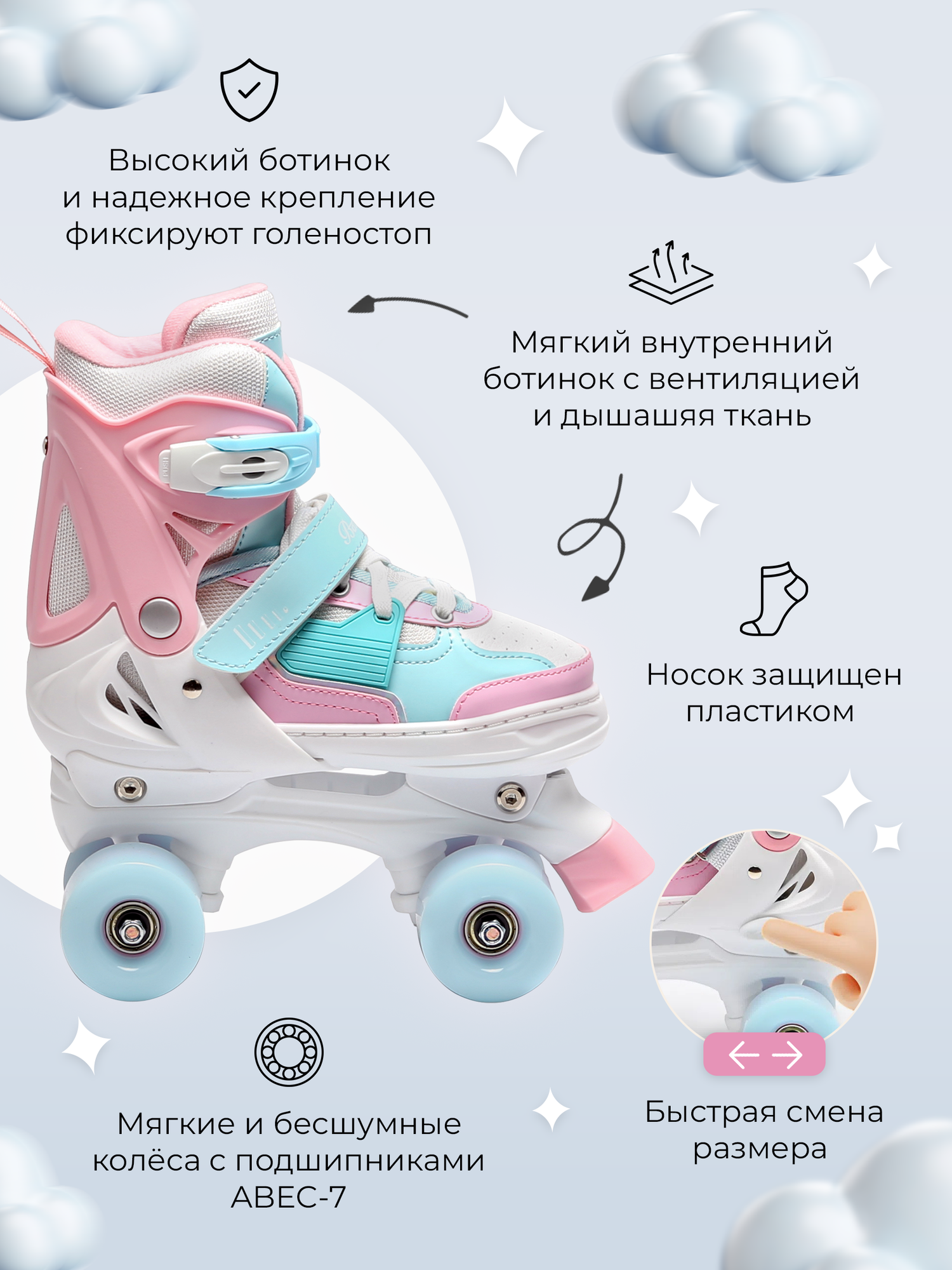 - Раздвижная система: Ролики легко регулируются по размеру, что позволяет им "расти" вместе с ножкой ребенка. Это делает их экономичным решением, так как одной пары хватит на несколько сезонов.