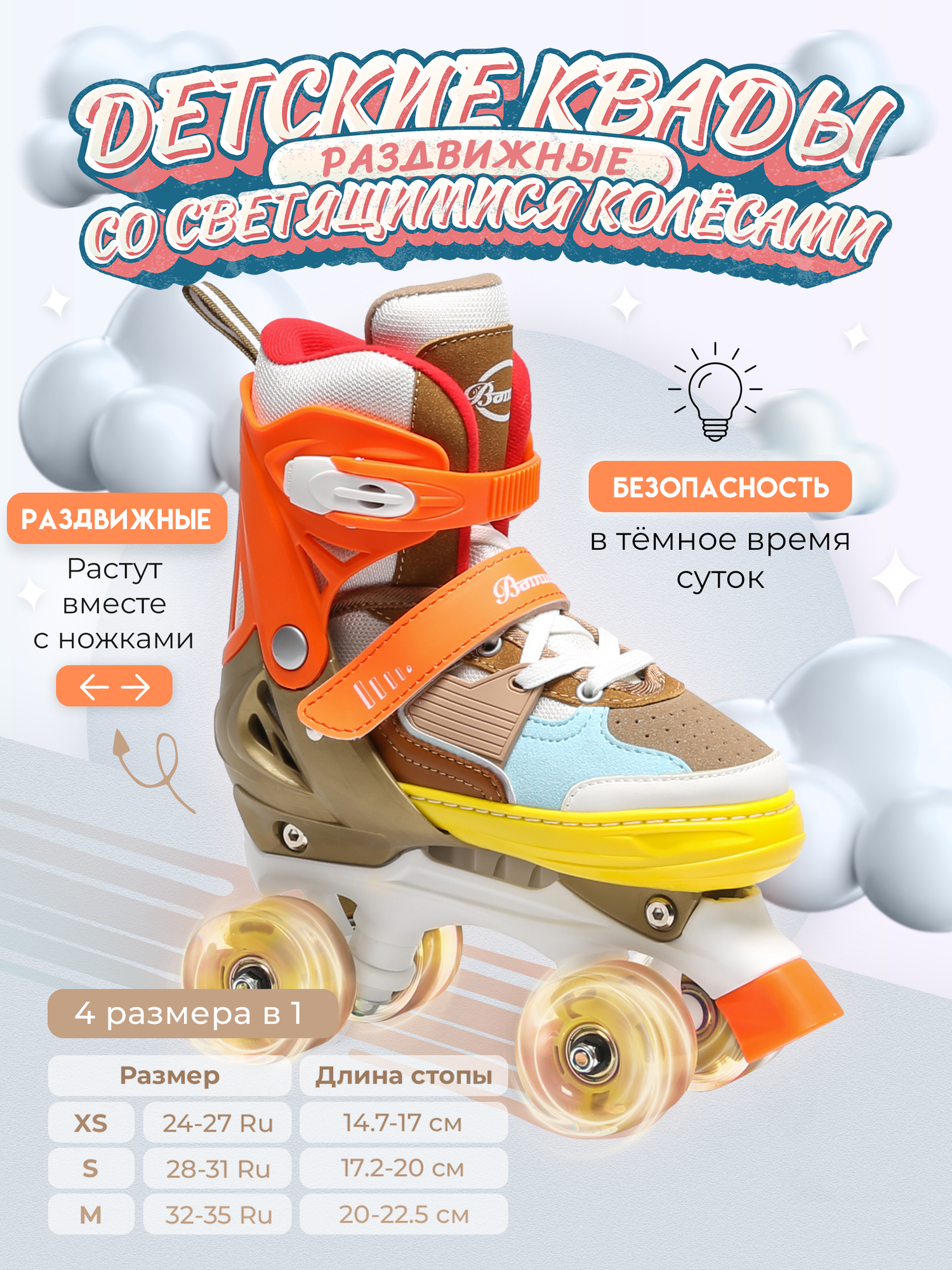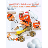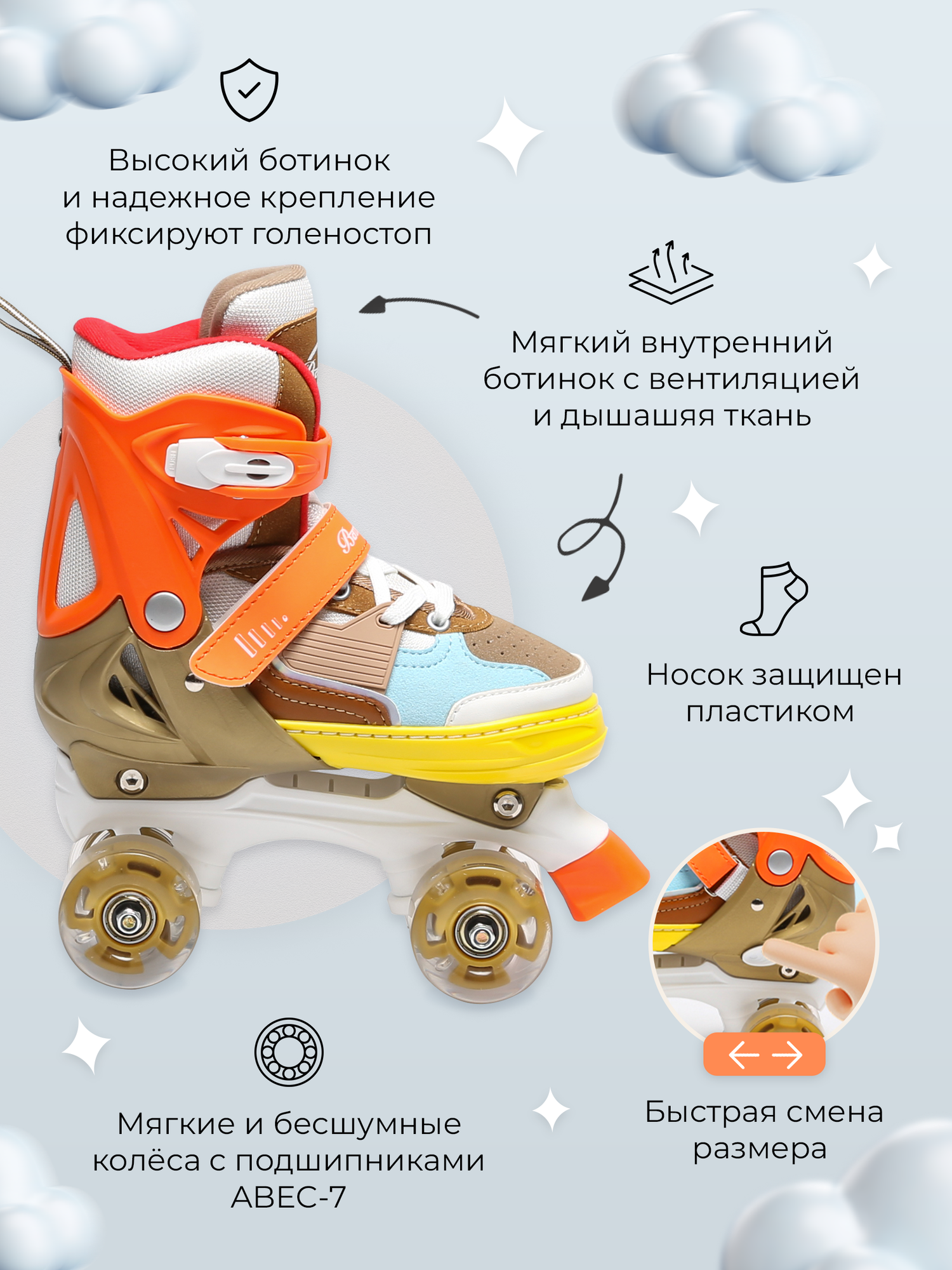 - Раздвижная система: Ролики легко регулируются по размеру, что позволяет им "расти" вместе с ножкой ребенка. Это делает их экономичным решением, так как одной пары хватит на несколько сезонов.