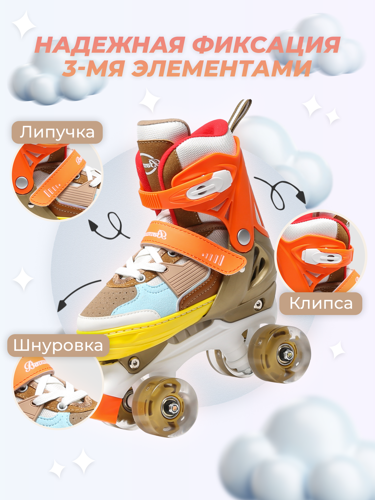 - Удобные крепления: Регулируемые клипсы, липучки и шнурки позволяют надежно фиксировать ролики на ноге, обеспечивая комфорт и безопасность.