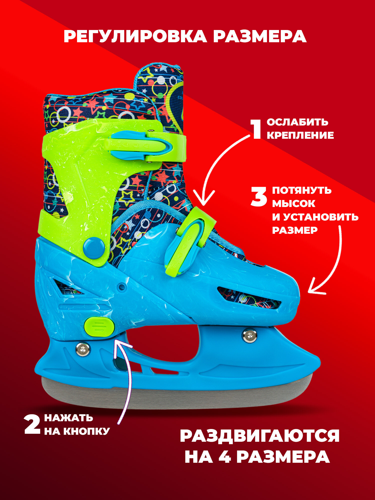 Ботинок: морозостойкий пластик. Язык: синтетический трикотаж с поролоном. Подкладка: текстиль, полиуретан. Стелька: EVA. Лезвие: универсальное из нержавеющей стали. Фиксация: клипса с фиксатором. Раздвижной механизм: кнопочный фиксатор (раздвигаются на 4 размера). Упаковка: сумка. Ледовые раздвижные детские коньки это идеальный выбор для активных и любящих кататься на льду детей. Они подойдут как для начинающих, так и для опытных маленьких фигуристов и хоккеистов. Благодаря своей раздвижной конструкции, они легко регулируются по размеру–на 4 размера! Это удобно, так как ваш ребенок сможет использовать их в течение многих лет. Для удобства и безопасности обеспечивают надежную фиксацию голеностопа и ноги, придают дополнительную уверенность и стабильность во время катания. Поставляются в комплекте с удобной сумкой для переноски и хранения. Сумка не только защитит ваши пластиковые коньки от повреждений, но и позволит вам удобно брать их с собой на каток. Корпус ботинка выполнен из ударопрочного пластика, что придает им дополнительную прочность и долговечность. Фиксируются с помощью ремешка и ремешка клипсы на голеностопе. Благодаря заводской заточке, они готовы к использованию сразу после покупки, не требуя дополнительного времени на подготовку. Качественные ледовые лезвия из нержавеющей стали обеспечивают хорошее скольжение и маневренность. Представляют идеальный выбор для девочек и мальчиков, которые хотят наслаждаться прогулками на льду, научится фигурному катанию или играть в хоккей. Их можно использовать как прогулочные, в спортивных зимних мероприятиях, для катания на льду и даже для ледовых фитнес тренировок. В нашем ассортименте так же имеется дополнительная экипировка – шлем, защита рук и ног, а так же белые женские фигурные и мужские взрослые хоккейные коньки. Для летнего сезона роликовые коньки. Эксклюзивная упаковка делает их отличным подарком для детей.