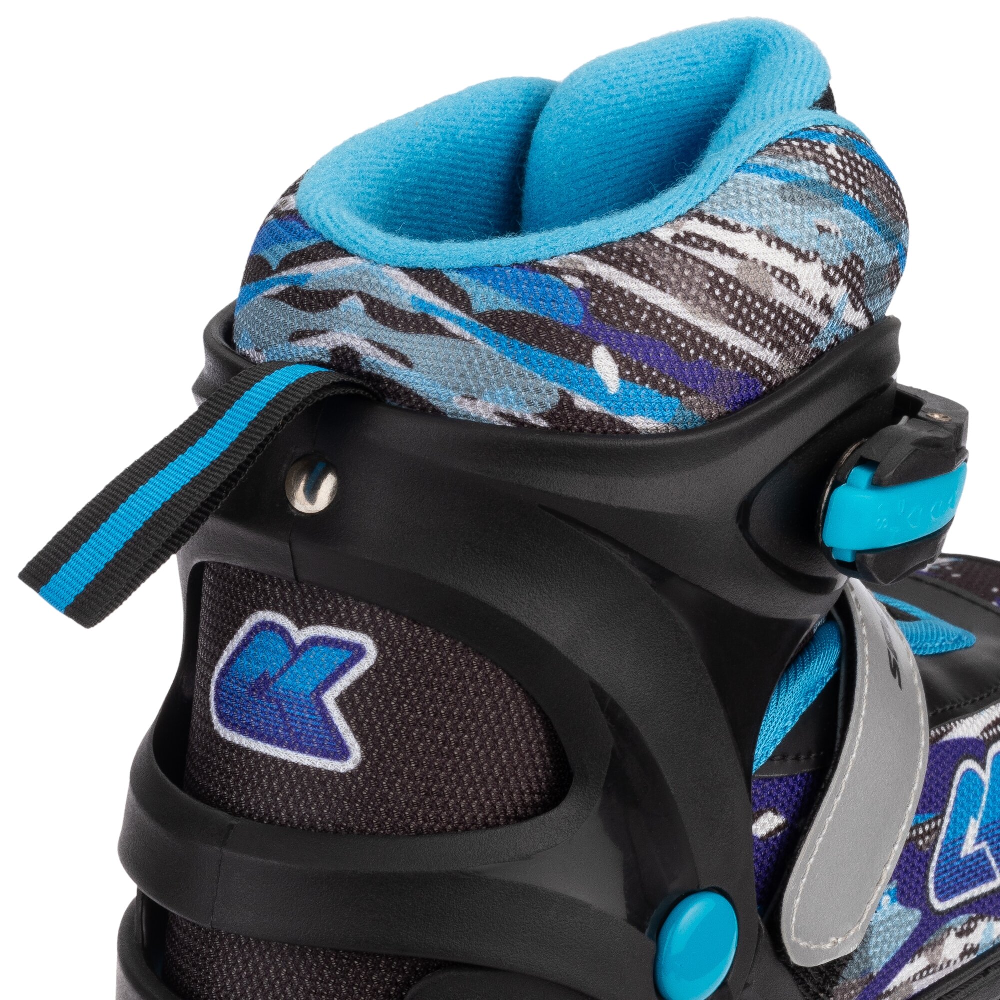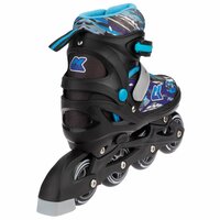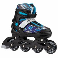 Роликовые раздвижные коньки. Раздвигаются на 4-е размера. Внешний ботинок: пластик, ткань. Внутренний ботинок: ткань, пенополиуретан. Тип фиксации: классическая система шнуровки, ремешок "velcro", клипса с фиксатором. Рама: пластик. Материал колеса: PU (полиуретан). Размер колес: XS/S - 64*22 мм.