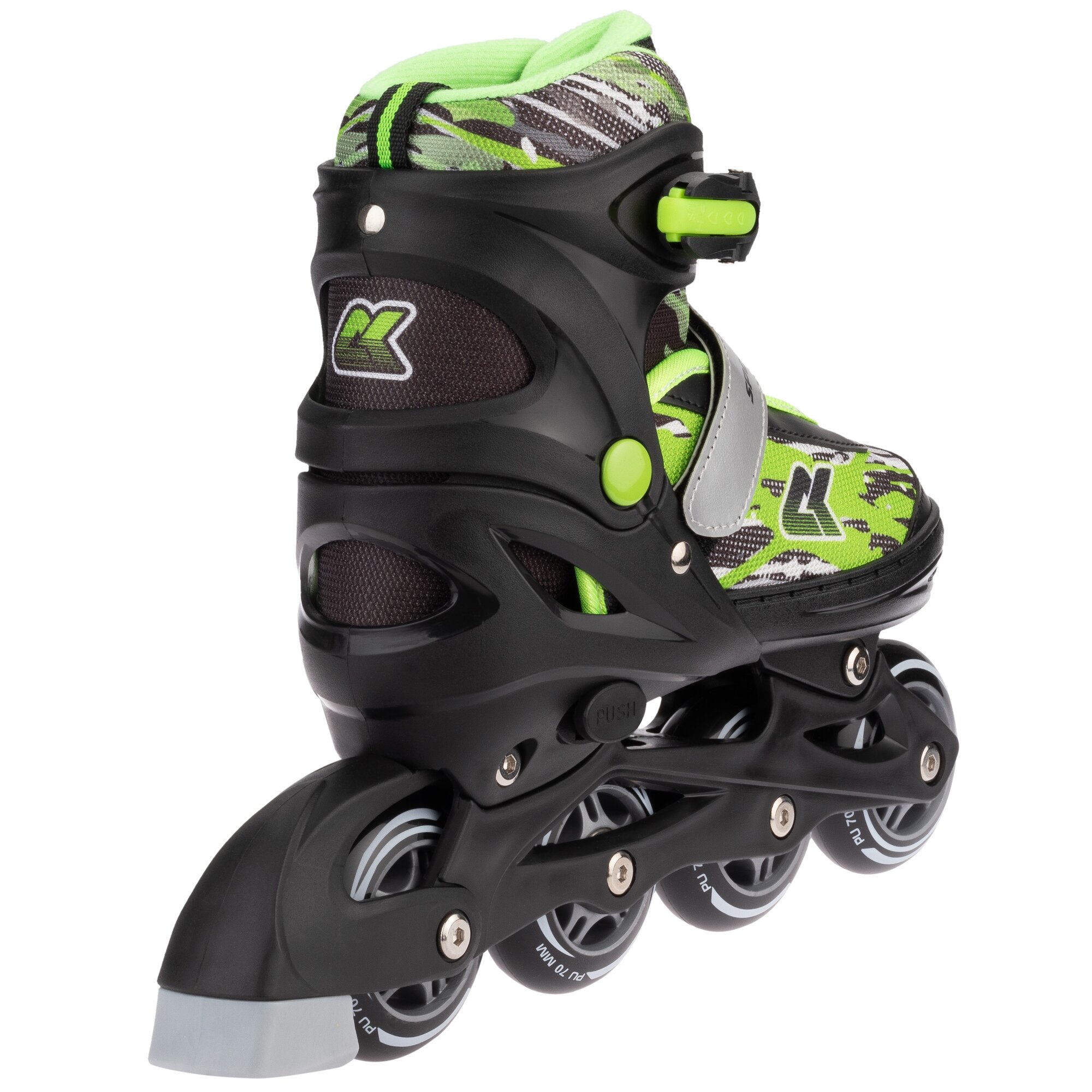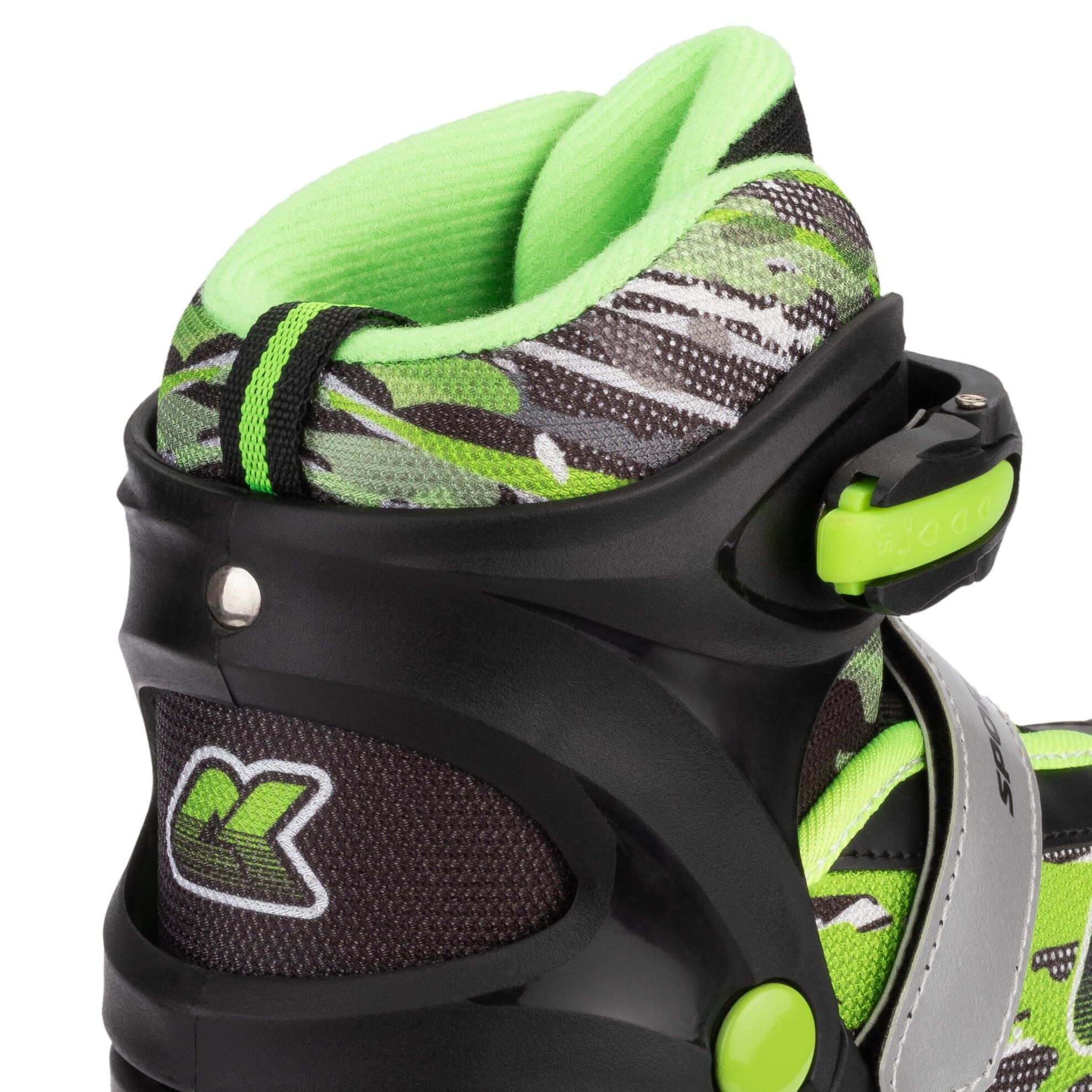 Роликовые раздвижные коньки. Раздвигаются на 4-е размера. Внешний ботинок: пластик, ткань. Внутренний ботинок: ткань, пенополиуретан. Тип фиксации: классическая система шнуровки, ремешок "velcro", клипса с фиксатором. Рама: пластик. Материал колеса: PU (полиуретан). Размер колес: XS/S - 64*22 мм.