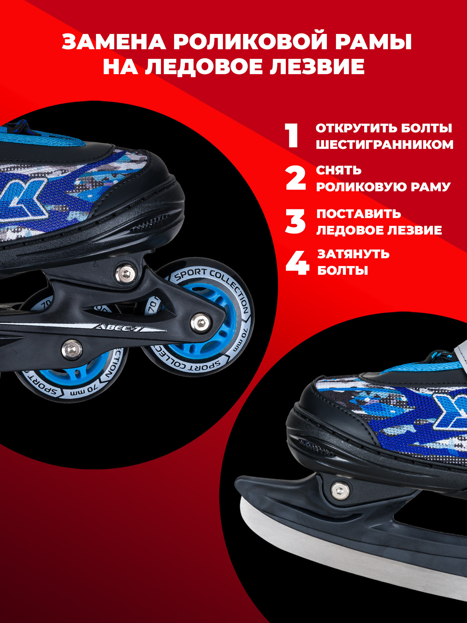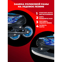 Характеристики: Роликовые раздвижные коньки-трансформеры. В комплекте идет сменное лезвие из нержавеющей стали. Раздвигаются на 4-е размера. Внешний ботинок: пластик, ткань. Внутренний ботинок: ткань, пенополиуретан. Тип фиксации: классическая система шнуровки, ремешок "velcro", клипса с фиксатором. Рама: пластик. Материал колеса: PU (полиуретан). Размер колес: XS/S - 64*22 мм, M/L - 70*22 ммРазмер XS имеет 3 колеса, размер S/M/L имеет 4 колесаПодшипник: ABEC-7 хром. Упаковка: удобная сумка с ручкой. Раздвижные коньки трансформеры идеально подходят для активного катания на льду и на асфальте, как мальчиков, так и девочек. Разработанные для подростков, они обеспечивают комфорт и безопасность во время зимних и летних прогулок. Лезвия из прочного материала гарантируют надежное скольжение по льду, а роликовая рама обеспечит комфортное катание на асфальте. Конструкция обуви продумана до мелочей: шнурки позволяют легко регулировать посадку, а клипсы обеспечивают дополнительную фиксацию. Эти модели раздвижные, что делает их идеальными для растущих детей. Спортивные черные и белые цвета придают стильный вид, подходящий для профессиональных занятий или просто развлечений на коньках. Эта экипировка станет отличным выбором как для начинающих, так и для опытных спортсменов. Защитные элементы помогут избежать травм во время катания. Роликовые версии также доступны, что позволяет разнообразить активный отдых в любое время года. Удобная сумка для переноски делает использование этих коньков еще более практичным.