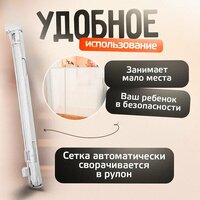 · Безопасно по сравнению с калиткой, нет металлических и деревянных прутьев, порогов, между которыми может застрять ребенок, споткнуться или удариться. Сетка, которая отделяет ребенка от закрытых для него проходов и комнат, произведена из достаточно гибкого и эластичного материала, благодаря чему малыши не смогут об нее травмироваться, как это часто происходит с аналогами из дерева и металла.