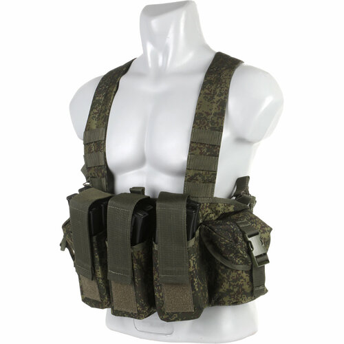 Легкий нагрудный разгрузочный жилет с максимально простым дизайном. На фронтальной стороне жилета расположены 3 подсумка под автоматные магазины (каждый вмещает до двух магазинов серии АК или M4/AR15), по бокам 2 универсальных подсумка с клапаном на фастексе. Есть 2 кармана под радиостанцию или дополнительный магазин, внутренний карман на липучке под документы / карту. На внутренней поверхности жилета есть велкро-панель для установки напашного подсумка. Длина лямок регулируется под фигуру владельца в диапазоне от ~46 до ~62 размера Вес ~450 г. Материал изготовления: ткань Кордон.