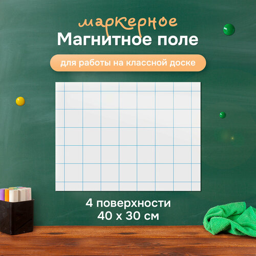 Комплект из 4-х листов гибкого магнита с разметкой в клетку (размер клетки 5*5 см). Каждый лист размера 40х30 см. Листы можно стыковать между собой, образовывая большое маркерное магнитное поле для работы на классной доске. Поверхность листов «Пиши-стирай». Вы можете использовать их многократно. Писать необходимо исключительно маркером на водной основе (в комплект не входит). Стереть такую надпись вы сможете любой сухой или чуть влажной губкой, тряпкой или салфеткой. Поставляется комплект в брендированной коробке из плотного картона.