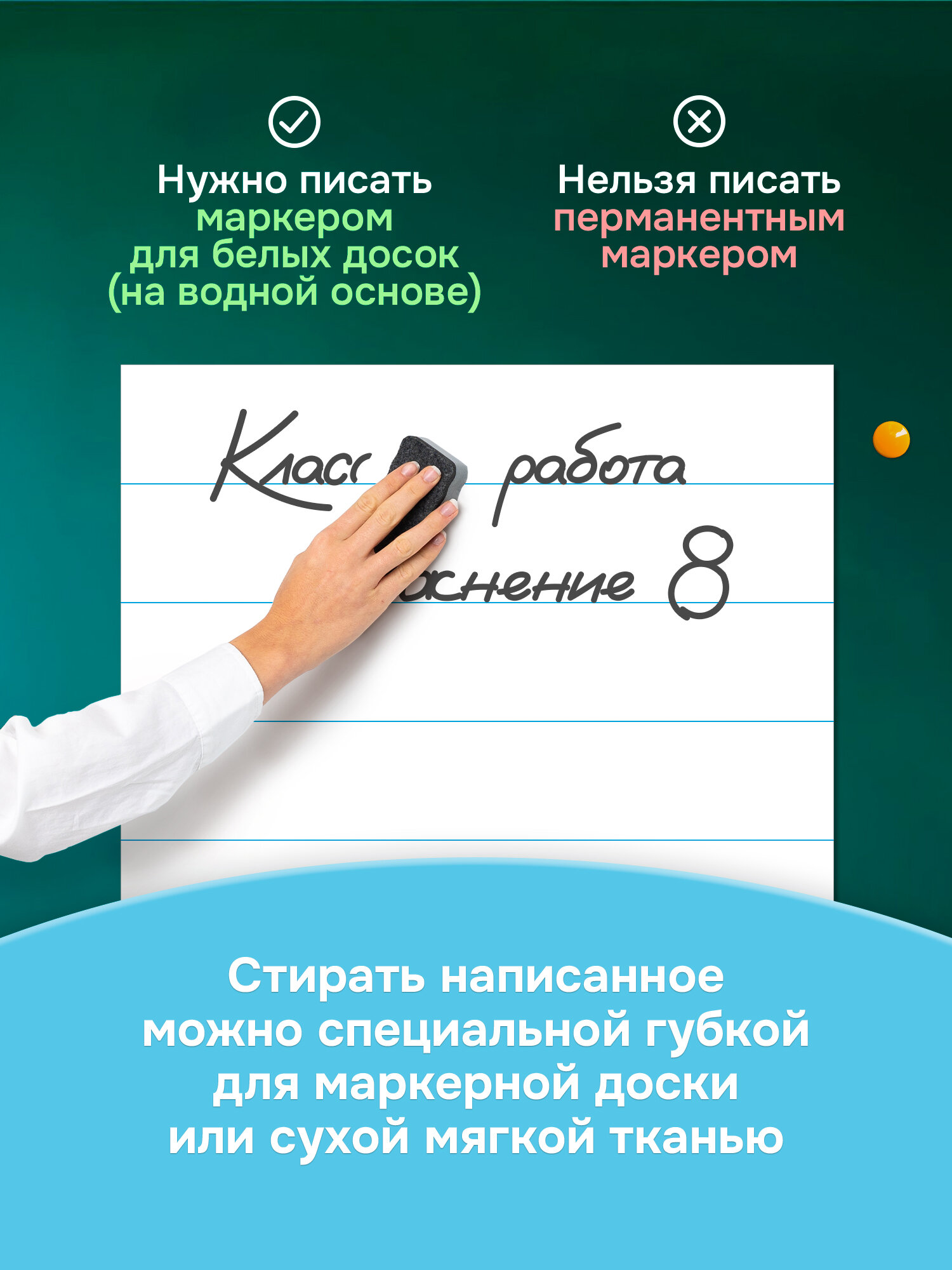 Разлиновка для школьной доски из гибкого магнита с разметкой в клетку (размер клетки 5*5 см). Одно большое полотно размера 90х60 см. Поверхность «Пиши-стирай» позволяет использовать разлиновку многократно. Писать необходимо исключительно маркером на водной основе (в комплект не входит). Стереть такую надпись вы сможете любой сухой или чуть влажной губкой, тряпкой или салфеткой. Для того, чтобы полотно прослужило вам долго, пожалуйста, внимательно изучите инструкцию по эксплуатации. Поставляется разлиновка в транспортировочной коробке из плотного картона.