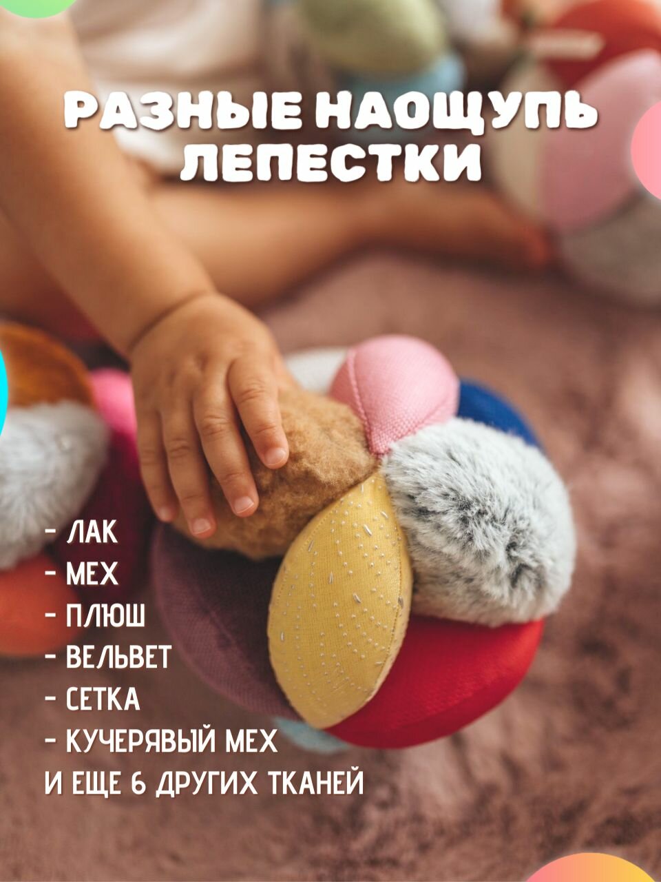 - разноцветные лепестки мячика помогут Вашему малышу развивать зрительное восприятие, а в дальнейшем в игровой форме выучить названия цветов;