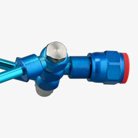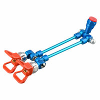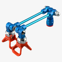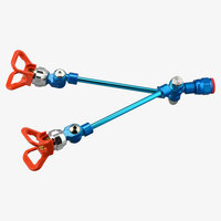 Разветвитель на два сопла предназначен для увеличения площади окрашиваемой поверхности за один проход. Также служит удлинителем длиной 30см. Каждый из двух удлинителей поворачивается отдельно, регулируя ширину распыления. Увеличение окрашиваемой площади достигается за счет подключения двух сопел к одному пистолету, благодаря чему увеличивается скорость покраски. Необходимо учитывать производительность аппарата, т. к. увеличение расхода краски, аналогично увеличению расхода при подключении двух окрасочных постов к аппарату. Соплодержатель с соплом устанавливается на каждую из двух удлинительных трубок. Затем устанавливается необходимый угол разведения трубок, соответствующий ширине факела каждого сопла с учетом необходимого перекрытия. Подключение к пистолету с резьбой 7/8"