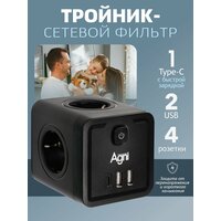 Купить Тройник для розетки AGNI, защита от перегрузки, 4 гнезда, 2 USB, TYPE C, быстрая зарядка с доставкой по всей России.