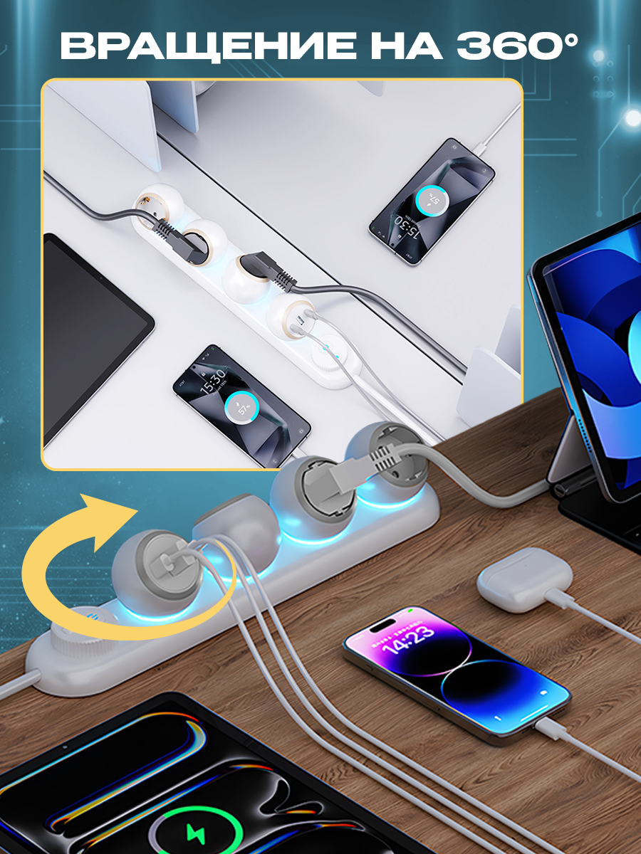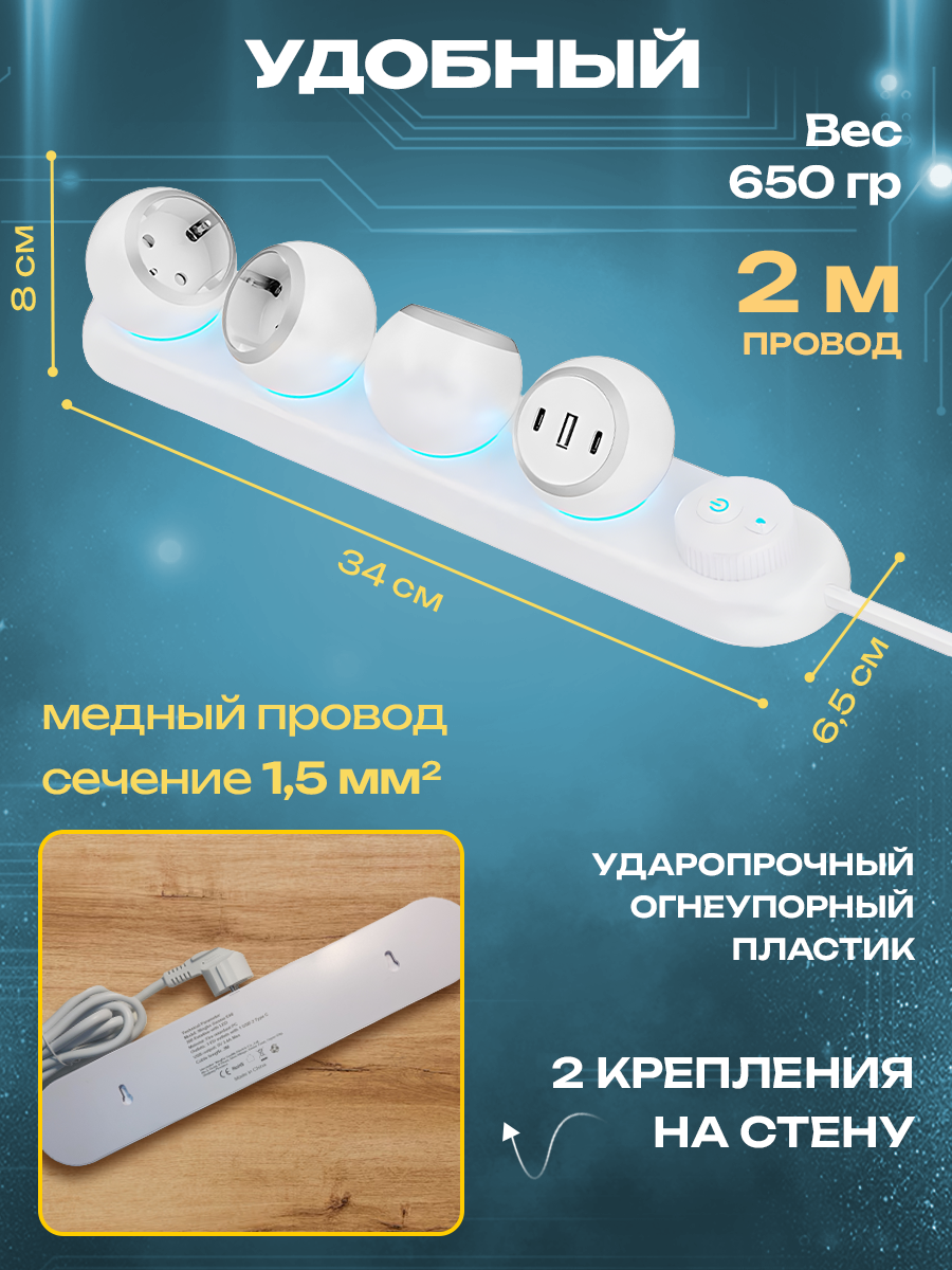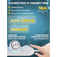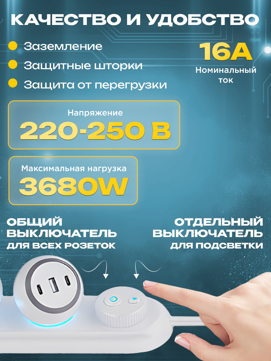 | Особенности | USB порт, выключатель на корпусе, выносная розетка, розетки с крышкой, световая индикация, шторки на розетке |
