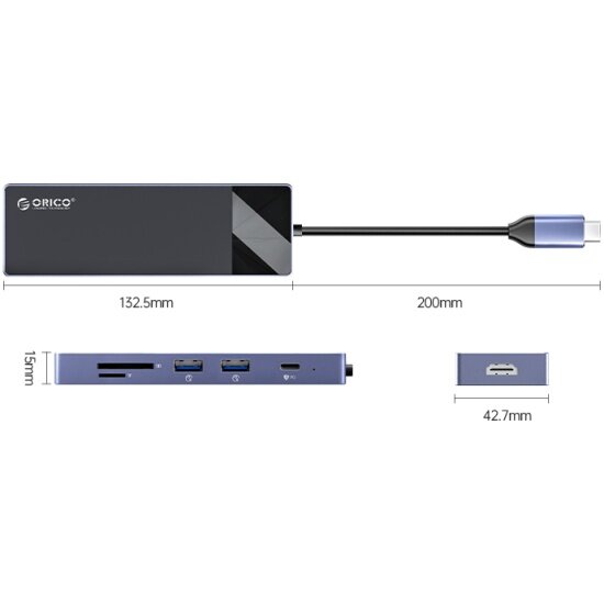Многофункциональная док-станция Orico 9 в 1. Корпус сделан из алюминиевого сплава и ABS-пластика. Интерфейс подключения USB Type-C со скоростью передачи данных до 5Гбит/с. Выходные интерфейсы: USB Type-C с поддержкойPD 100Вт, HDMI 4К 30Гц, USB-A 3.0 х3 со скоростью до 5Гбит/с, USB-A 2.0 со скоростью до 480Мбит/с, USB Type-C, microSD, SD