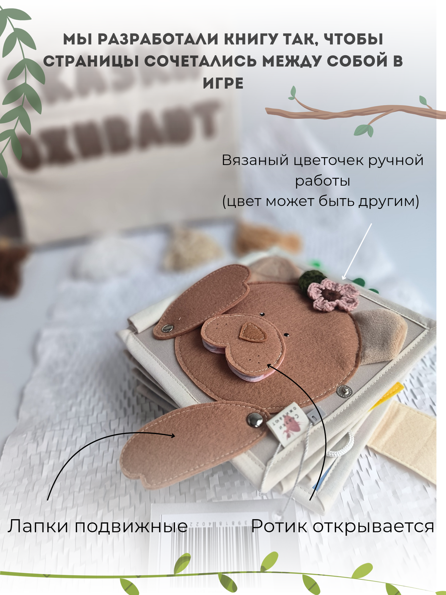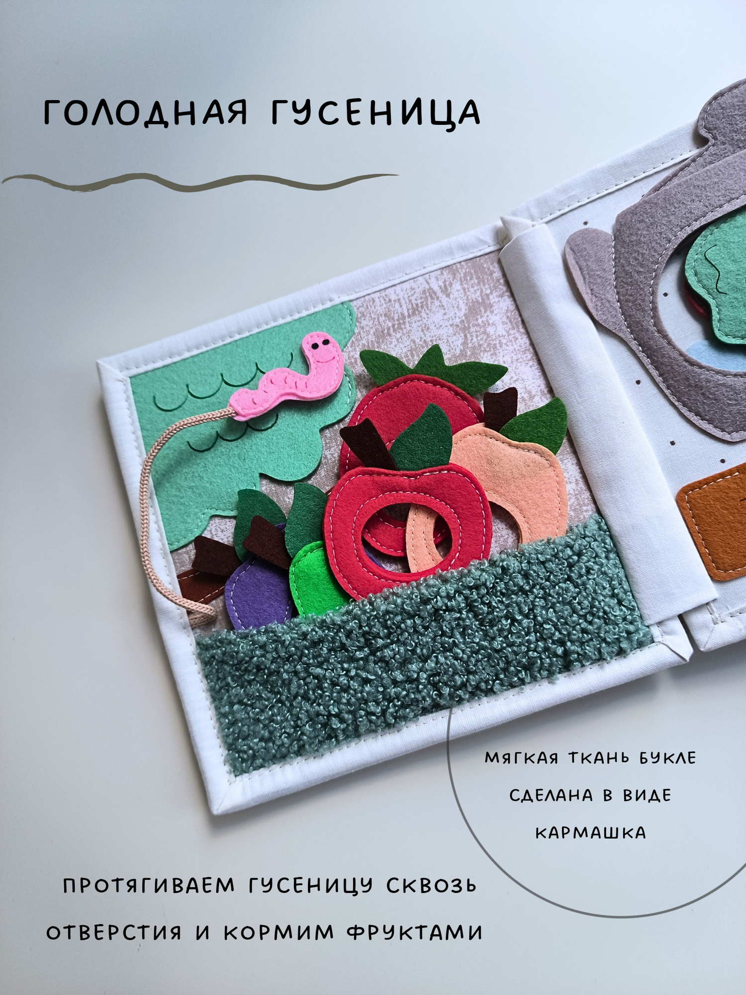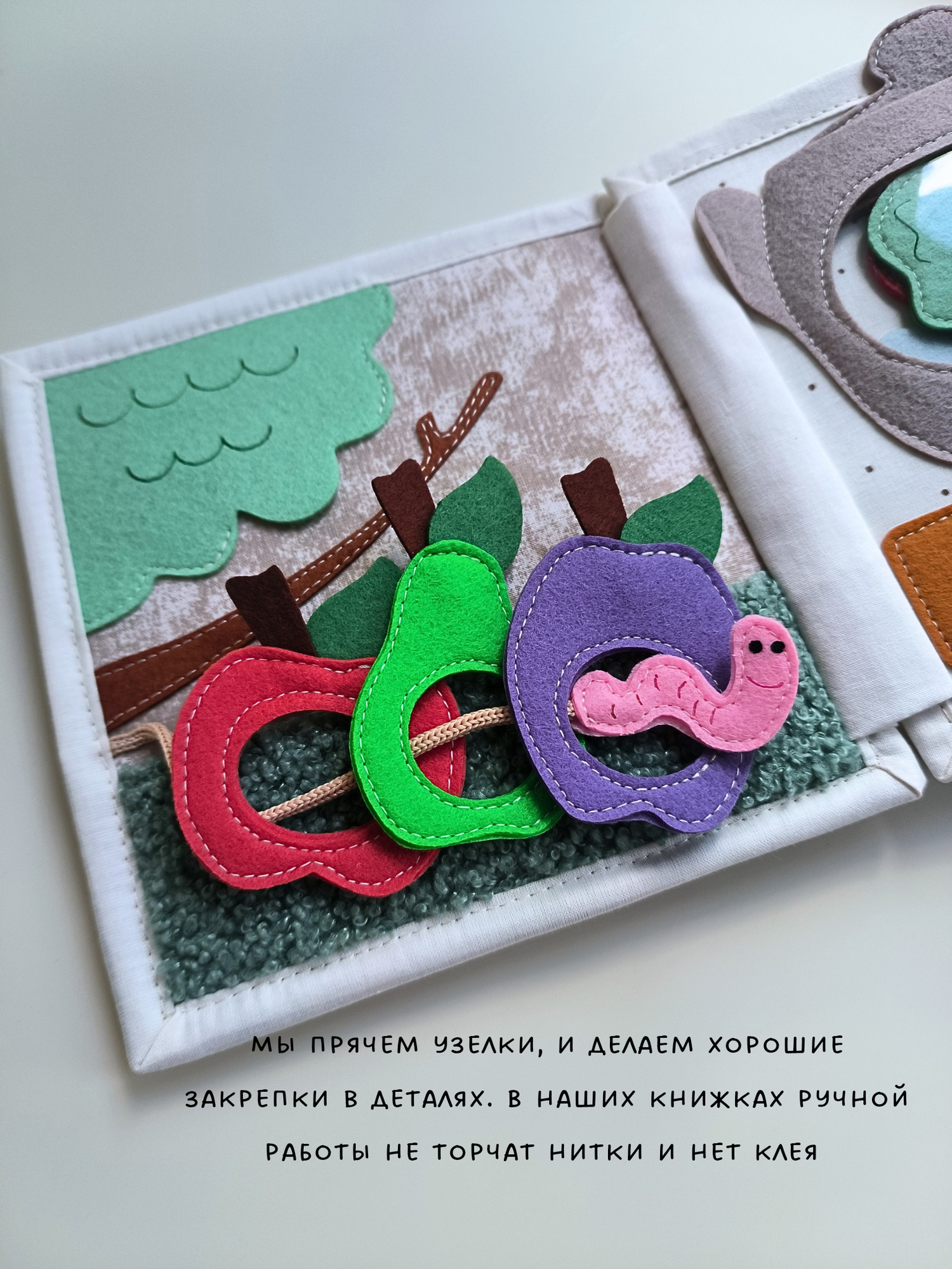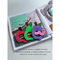 Мы используем только качественные материалы - корейский жёсткий фетр, толщина 1,2 мм, с таким фетром ребенку удобно взаимодействовать. Турецкий ранфорс премиум используется на основе книжки.