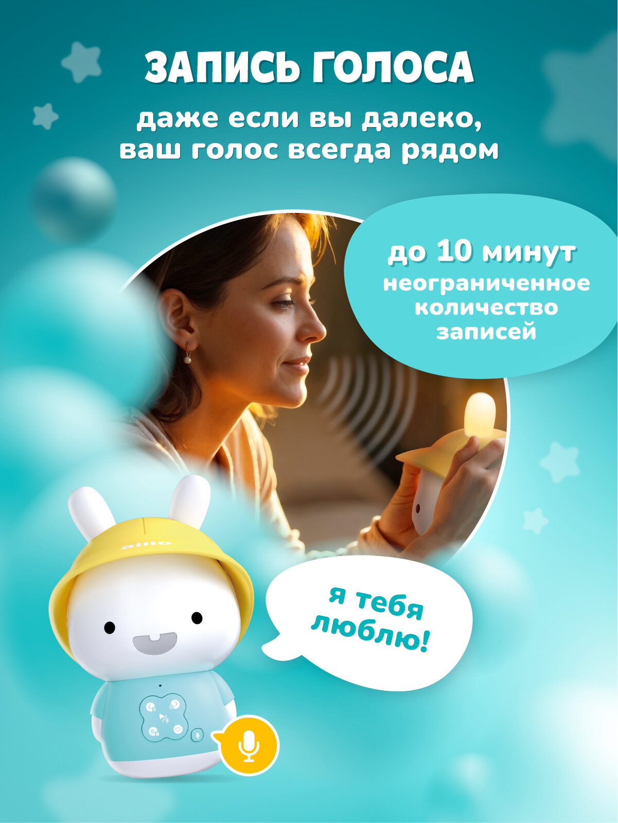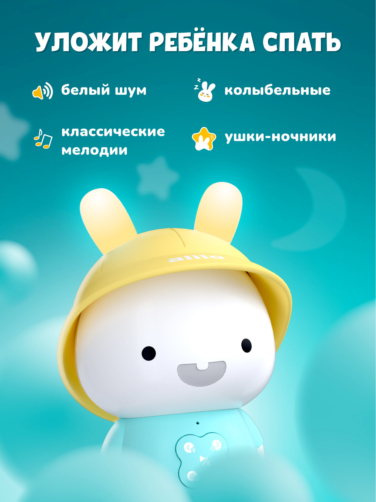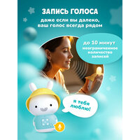 многофункциональный: пою песенки и читаю сказки, играю белый шум и музыку для сна, а ещё превращаюсь в ночник! для детей: создан таким, чтобы управление было удобным для маленьких ручек. безопасный: у меня нет острых углов, а ушки сделаны из безопасного RoHS-силикона. Даже динамик сделан специально с учётом защиты детского слуха. неограниченный контент: при помощи Bluetooth можно проигрывать контент с других устройств. долговечный: ударопрочная конструкция из ABS-пластика, который в 30 раз прочнее обычного. А батарея – аккумуляторная. встроенная память: у меня есть встроенная память на 8 Гб. Я могу запомнить до 1000 песен или 200 сказок. включить И продолжить: функция включения и продолжения запоминает, где было остановлено проигрывание во время отключения, и продолжает его с этого же места. Очень удобно! добавление В избранное: можно добавить понравившиеся песенки или сказки в избранное. успокаивающие звуки: на мне записано много различных звуков и мелодий для сна (белый шум, шум моря, шум сердцебиения и т. д.). Со мной всегда будет легко заснуть. функция автоотключения: если в течение 30 минут со мной никто не будет играть, я перейду в режим сна (эту фукнцию можно отключить). Чтобы меня разбудить, просто нажмите любую кнопку.