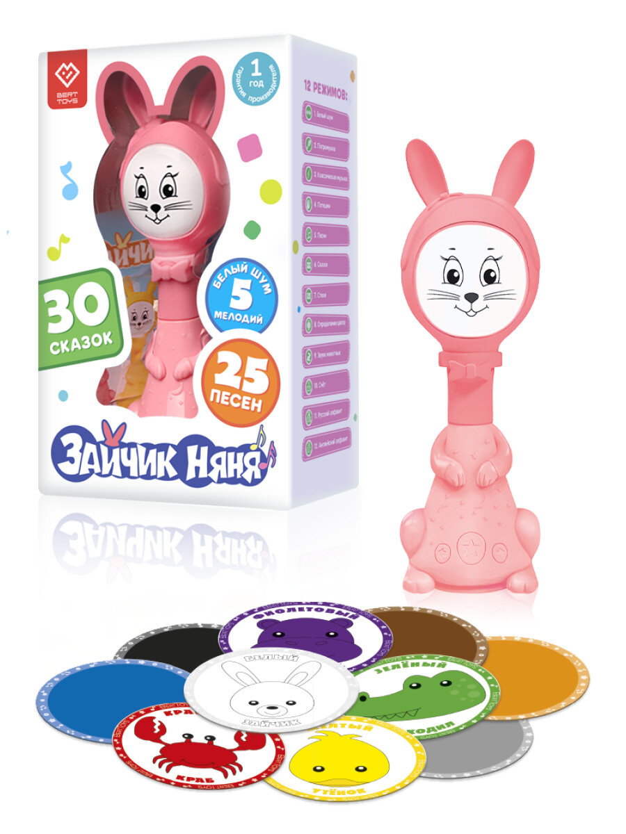 Помощник маме, друг ребенку - интерактивная, музыкальная, развивающая игрушка Зайчик Няня, для новорожденных 0+, девочек, мальчиков и малышей. Зайка поможет успокоить малыша и настроить на крепкий сон - беспрерывный белый шум длится до двух часов. Ушки грызунки помогут облегчить прорезывание зубов. Заяц рассказывает 30 добрых сказок от начала и до конца, поет 25 добрых песенок, издает 70 звуков погремушки, воспроизводит 10 классических мелодий известных авторов (Шопен, Шуберт, Чайковский и др.), знает 40 названий животных и произносит их голоса, расскажет 20 интересных потешек. Зайка Няня научит считать до 20, обучит алфавиту на двух языках - русский и английский. Мягкий свет ночника поможет заснуть малышу сладким сном одному в кроватке. Корпус выполнен из прочного abs-пластика, уши из пищевого силикона, полностью безопасен для детей, не вызывает аллергическую реакцию. Зайчонок определяет цвета. Игрушки от BertToys предназначены до года, 2 лет, 3 лет, 4 лет, 5 лет. В комплекте 10 цветных карточек для режима: определения цвета. Заряжается от USB кабеля. Гарантия 12 месяцев.
