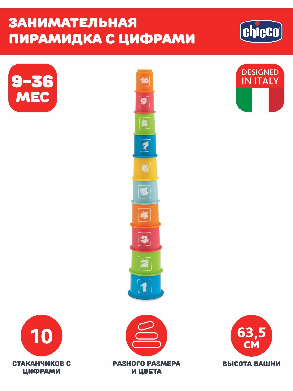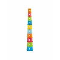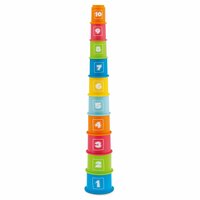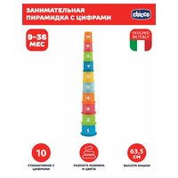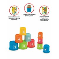 - В распоряжении ребенка появится набор разноцветных стаканчиков, которые кроха сможет выстроить в высокую пирамидку. Эта игра превратится еще и в обучающее занятие, так как на корпусе формочек изображены цифры от 1 до 10.