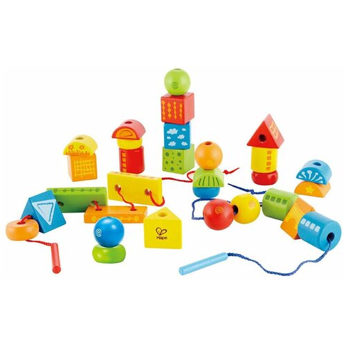 • 32 разноцветных деревянных блока, который легко одеваются на нить.