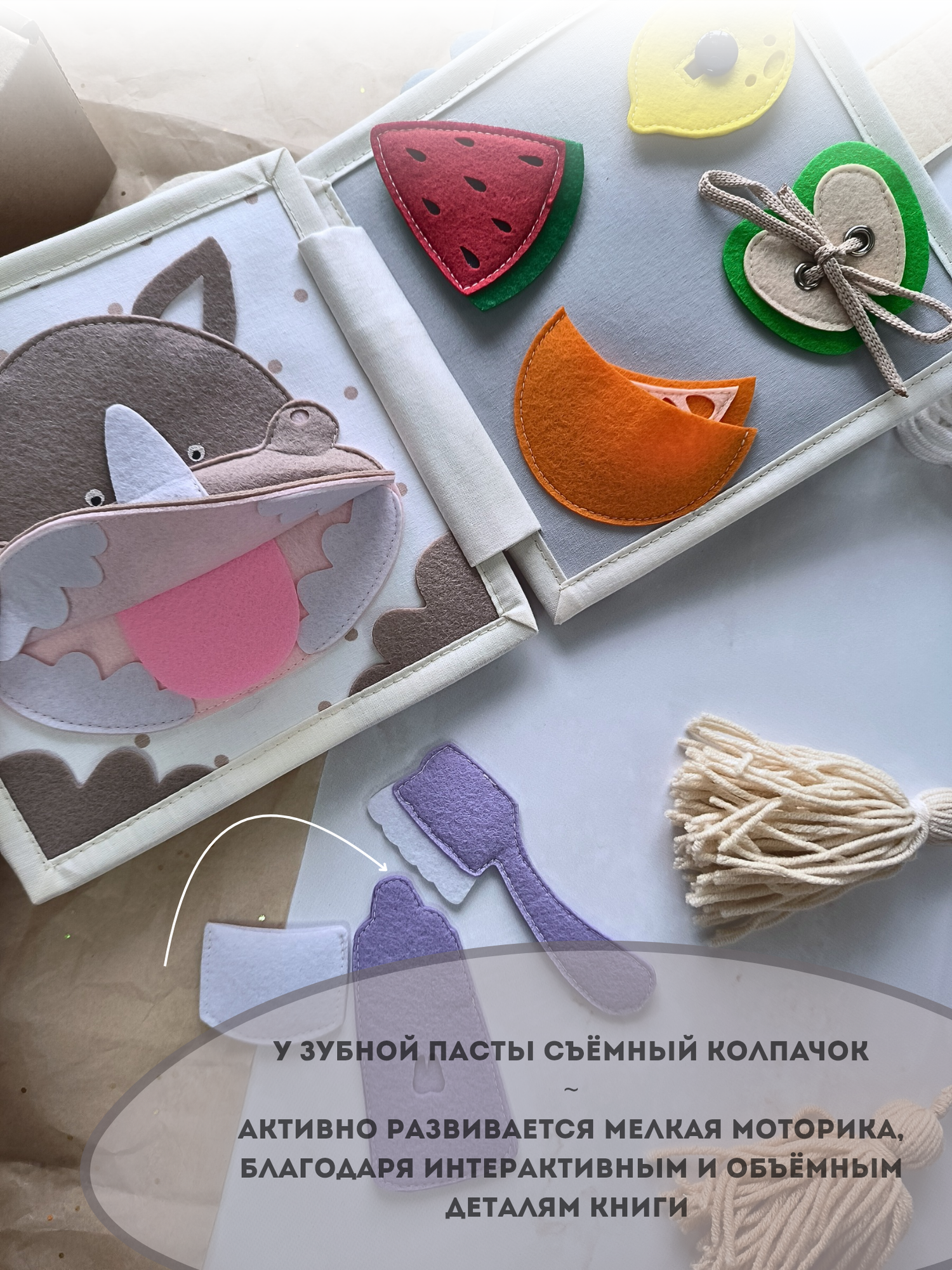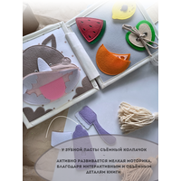 Развивающая книжка игрушка из фетра для детей в формате Лайт бук. Размер книжки игрушки 16*16 см. В мягкой книге 5 интерактивных игр страниц, которые сочетаются между собой в игре. Книжка мягкая бизи борд поможет в развитии мелкой моторики ребёнка, речи. Книжка из фетра поможет в развитии координации движений, помещая деталь из фетра на нужную застёжку. Мы оснадили книжку разными застёжками, липучками, пуговицами и шнуровкой, что очень благоприятно влияет на развитие ребёнка. Под плотной сеточкой перебираем бусинки, которые имитируют муравьёв. Дети очень любят гонять бусинки под сеточкой концентрируясь на развивающим заданием. Такая 3Д игрушка станет лучшим помощником для освоения новых навыков. Наши книжки сказки оживают - это полностью ручная работа. Мы не клеим липучки, а пришиваем прочно и надёжно. Книжка игрушка из фетра отличается своим качеством и безопасными материалами. Мы с уважением относимся к нашим маленьким покупателям , и очень хотим, чтобы ребёнок книжку оценил и увлекался интерактивными заданиями. Мы используем турецкий ранфорс хлопок для основы фона книги, и корейский жёсткий фетр - не тянется и не рвётся. У фетра толщина 1,2 мм и ребенку удобно познавать функциональность книги.