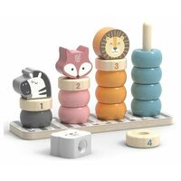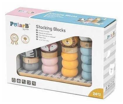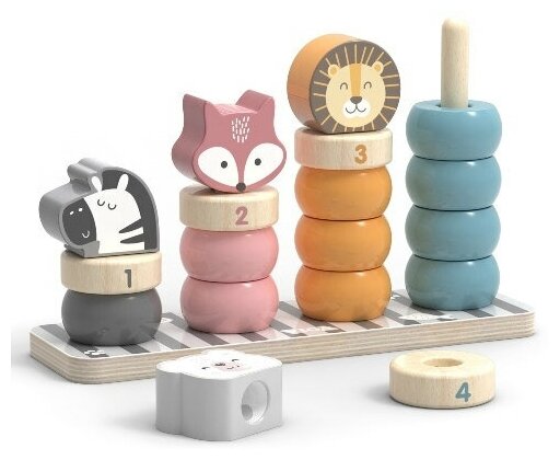 С деревянным сортером-пирамидкой Viga Toys PolarB Зверята малыш соберет 4 пирамидки разных цветов с мордочками животных на верхушке. На стержни разной высоты в подставке можно нанизывать деревянные кольца. Развивающая игрушка понравится малышам в возрасте от 18 месяцев. Игры с пирамидками тренируют мелкую моторику, мышление, воображение, зрительно-моторную координацию. Также дети познакомятся со счетом до 4, понятиями количество и больше-меньше. А еще запомнят названия зверей: зебры, лисички, льва и мишки. Деревянные пирамидки помогают малышам развивать память, логическое мышление, цветовое восприятие. Все детали развивающей деревянной игрушки изготовлены из качественного материала и покрыты гипоаллергенными красками. Пастельная расцветка игрушек серии PolarB положительно влияет на настроение ребенка. Пирамидка-сортер соответствует европейскому EN71 и американскому ASTM стандартам качества и безопасности. В комплекте: подставка с 4 стержнями 14 колец 4 верхушки