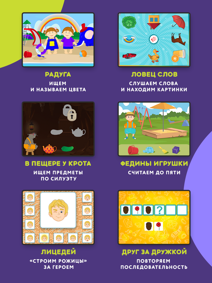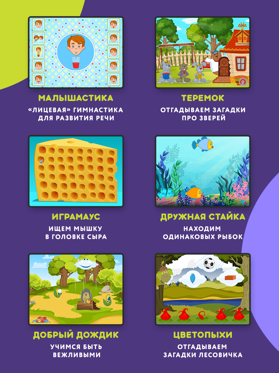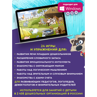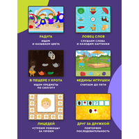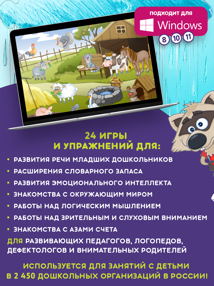 24 игры и упражнения для: развития речи младших дошкольников, активизации речи неговорящих детей, работы над логическим мышлением, развития эмоционального интеллекта, знакомства с окружающим миром, расширения словарного запаса, знакомства с азами счета, работы над зрительным и слуховым вниманием. Каждая игра создает ситуацию диалога, вовлекают в общение с педагогом или персонажем. Например, в игре «Кис-кис-мяу» ребенок нажимает на предметы, наблюдает за действиями кота Барсика и говорит, что тот делает. Педагог может задать дополнительные вопросы: есть ли у ребенка кот, как его зовут, что он делает и так далее. Задания игр разнообразны: повторить мимику героя, найти домик животного, расчистить сугроб, полить растения. Они помогут не только стимулировать речь, но и развить полезные навыки: расширить словарный запас, научиться считать, познакомиться с правилами поведения и другие. В набор входят игры на развитие высших психических функций: внимания, памяти и мышления. Это игры на выстраивание логических цепочек, сравнение предметов, отгадывание загадок, выделение схожих объектов и другие действия.
