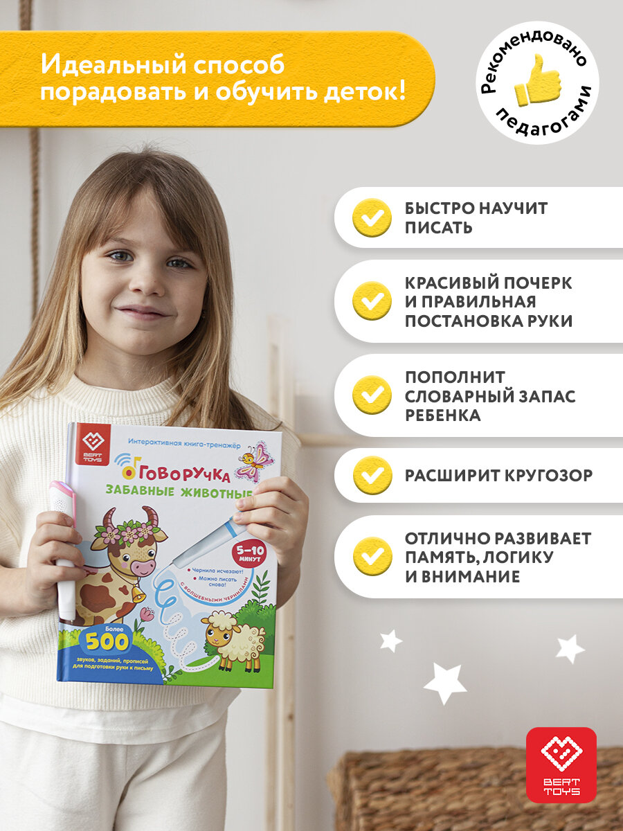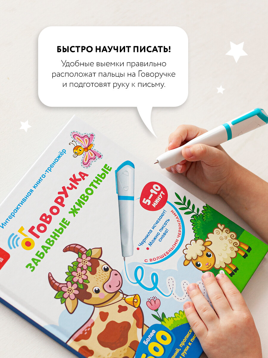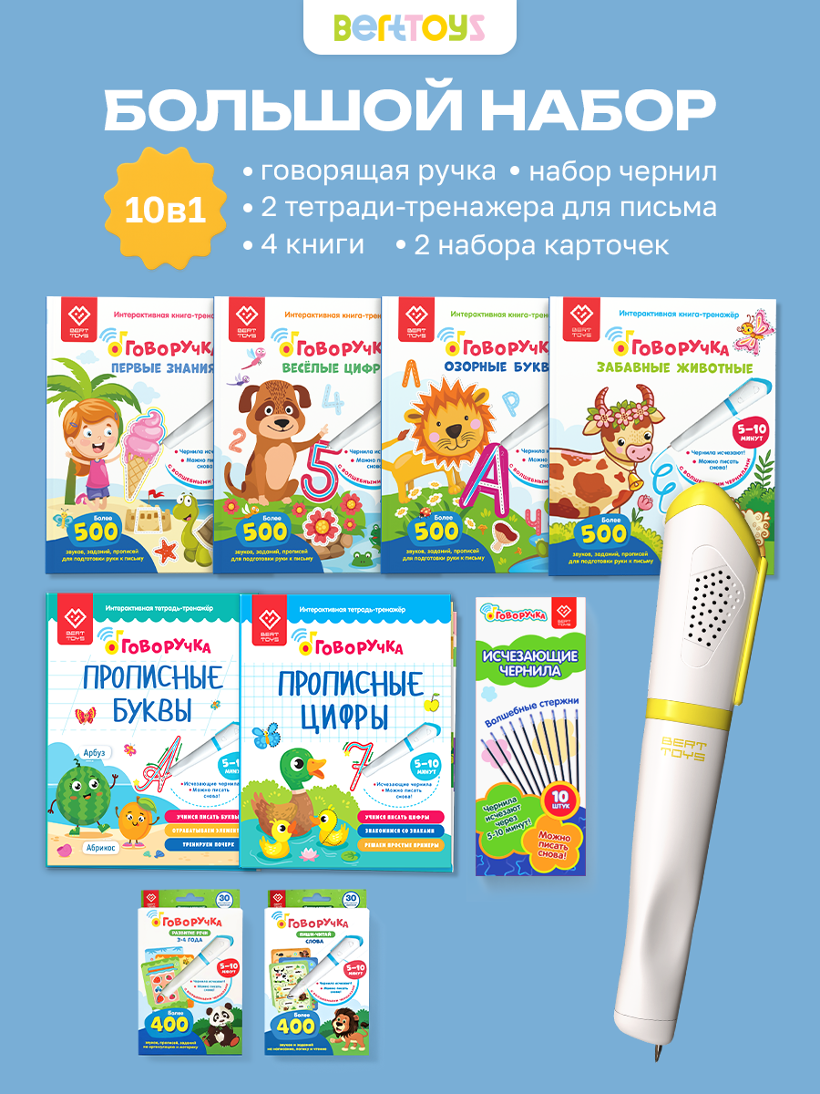В комплект входит: обучающая ручка - тренажёр Говоручка + 2 книги Озорные буквы , Забавные животные , 10 специальных стержней с исчезающими чернилами . Чтобы правильно поставить руку для освоения письма и потом легко справляться с программой начальной школы. Обучающая ручка - тренажёр Говоручка – отличная развивающая игрушка в подарок для девочек и мальчиков и незаменимая помощь родителям в подготовке детей к школе . Чтобы правильно поставить руку для освоения письма и потом легко справляться с программой начальной школы , важно начать использовать прописи как можно раньше . Но непоседливым малышам бывает сложно сосредоточиться и справиться с непослушными пальчиками , поэтому они не хотят заниматься в прописях. С интерактивной ручкой эта проблема будет решена раз и навсегда , ведь писать и рисовать волшебными исчезающими чернилами захочет каждый ребёнок ! Давайте посмотрим , чем ещё может удивить музыкальная обучающая игрушка Говоручка . Это многофункциональная обучалка . Приобретая её , вы получаете тренажёр для развития мелкой моторики и подготовки руки к письму , мини - проигрыватель встроенного контента , обучающую игру , волшебную ручку и комплект многоразовых прописей . В набор также включены 10 специальных стержней с защитными колпачками для долговременного использования и весёлая книга - Забавные животные - в подарок девочке 5 лет. Это лучший учитель и весёлый друг , которого ребёнок всегда будет внимательно слушать и занятия с которым никогда не наскучат . Интерактивная детская игрушка Говоручка сама озвучивает картинки , буквы и слова в книге , читает забавные стишки и даёт задания . Девочки и мальчики от 2 до 7 лет сначала обводят дорожки и проходят лабиринты , а потом с радостью переходят к более сложным заданиям – изучению и прописыванию букв и слов . Эргономичная форма со специальными выемками для пальчиков помогает сразу правильно взять ручку - тренажёр , чтобы научиться писать легко и быстро . Это удивительная волшебная игра , во время которой дети незаметно осваивают важные навыки , причём делают это без принуждения . В этом помогает уникальная новинка – исчезающие чернила . ( По секрету : даже мамы и папы тайком пробуют выполнить несколько заданий , чтобы почувствовать себя чародеями , а сколько радости дарит «Говоручка» мальчикам и девочкам ! ) Это 24 плотные страницы со множеством заданий . Благодаря исчезающим через 5 – 10 минут чернилам их можно выполнять сколько угодно раз и использовать прописи снова и снова ! А если вспомнить про специально разработанный дополнительный контент ( новые книги и карточки ) , который можно загружать в развивающие игрушки от года BertToys , возможности для игр и развития просто безграничны !