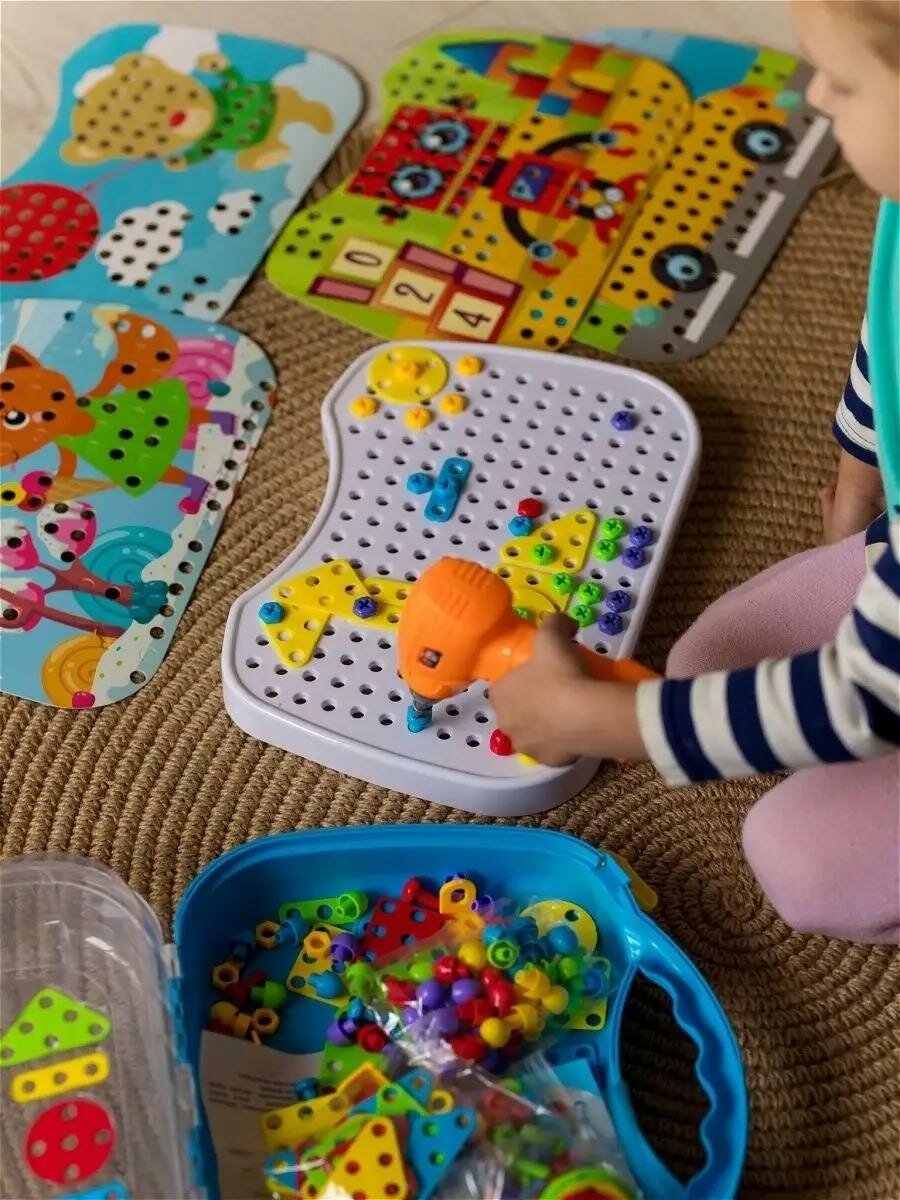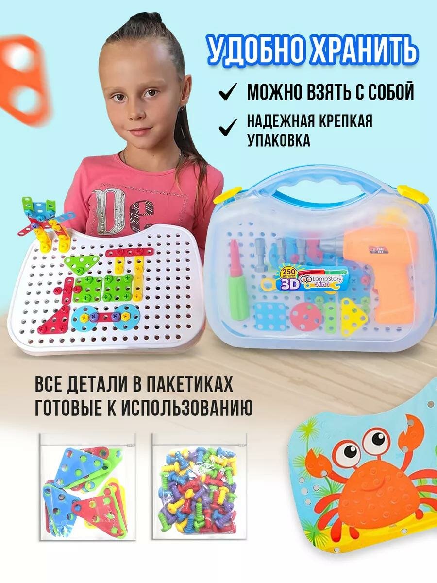 Купить Развивающий детский конструктор с шуруповертом LampStory 3D еврочемодан (250 детали + 8 карточек + мозаика) от 3 лет с доставкой по всей России.