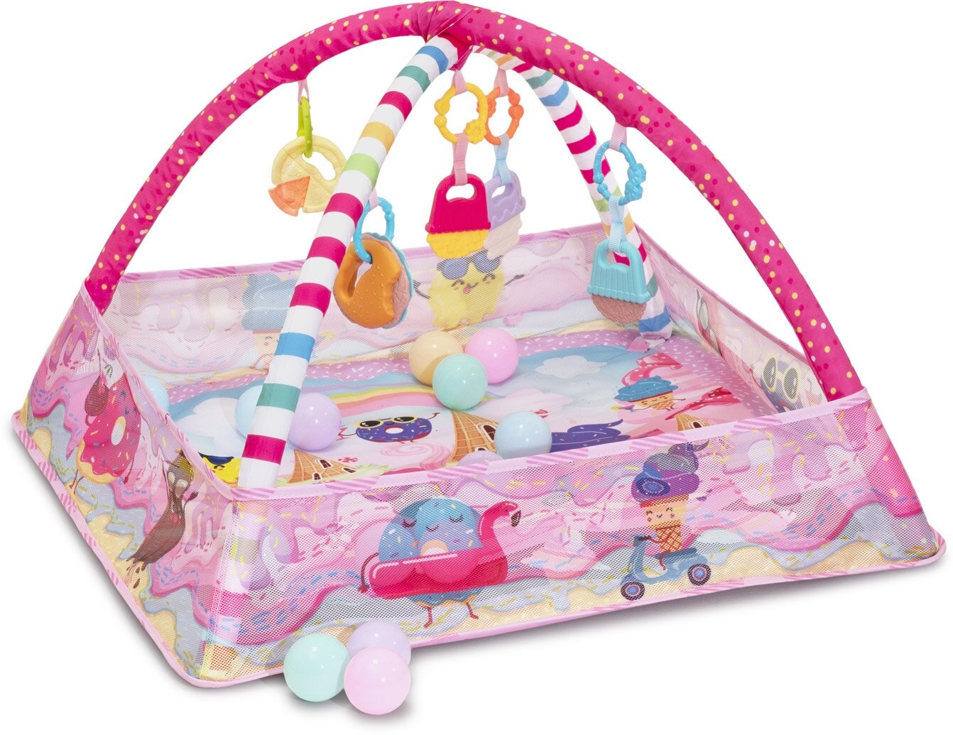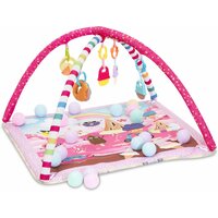 | Комплектация | коврик, две игровые дуги с 5 съемными игрушками (3 пластиковые погремушки, безопасное зеркальце и шуршащая с изображениями животных книжечка с пищалкой), 18 пластмассовых шариков, сетка-манеж |
