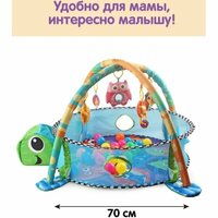 Развивающий коврик Черепашка - уникальный центр, с возможностью использования в двух форматах, мягкий коврик с игрушками и компактный манеж с бортиком-сеткой, наполненный яркими шарами. Мягкий коврик в форме морской черепахи с двумя перекрестными дугами имеет в комплекте 5 подвесных игрушек. Игрушки снимаются, можно прикрепить их на коляску, кроватку или играть отдельно. Коврик с легкостью превращается в мини-манеж с шарами - достаточно просто поднять сетчатые бортики. В голове коврика-черепахи хранятся 30 ярких шаров, которые ни одного малыша не оставят равнодушным. Размер коврика: 85*85*56 см