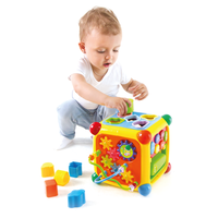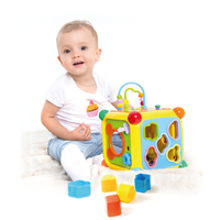 На каждой стороне куба находятся разные развивающие игры: сортеры, игрушка-лабиринт, телефон для малышей, музыкальное пианино и дверца, с помощью которой куб можно открывать. Игрушка работает от 4 батареек ААА (входят в комплект). Габариты упаковки 28см x 20см x 20см