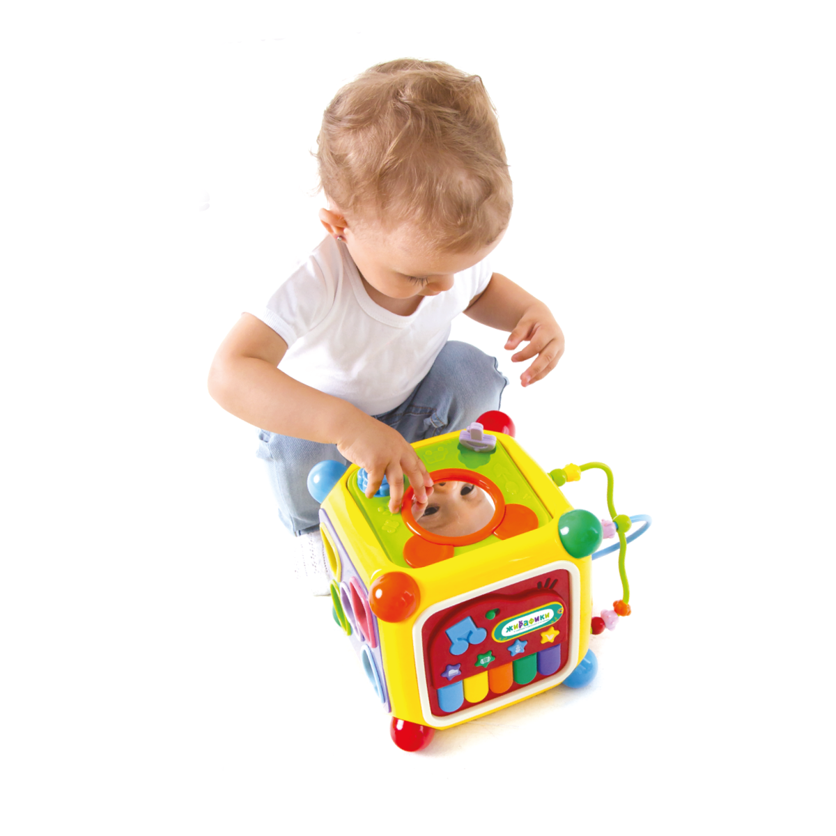 Это настоящий многофункциональный игровой центр! На каждой стороне куба — разные развивающие игры. На двух сторонах расположены сортеры — фигурные отверстия, через которые малыш должен протолкнуть внутрь куба фигурные элементы. На третьей стороне — игрушка-лабиринт с разноцветными колечками и шестеренки, которые можно вращать. Четвертая сторона — это телефон для малышей с большими кнопками. Игра с телефоном сопровождается различными звуками и мелодиями, звук включается с помощью кнопки on/off, расположенной на этой же стороне. Здесь же есть складная ручка для переноски куба. Пятая сторона — музыкальное пианино со своим отдельным переключателем питания on/off. У пианино — пять клавиш разного цвета и четыре функциональных кнопки с изображением музыкальных инструментов. При нажатии на функциональные кнопки звучание пианино становится похожим на звучание соответствующего музыкального инструмента. Еще одна кнопка в виде ноток, расположенная здесь же, включает режим проигрывания мелодий. Шестая сторона — это дверца, с помощью которой куб можно открывать. Дверца открывается ключиком, присоединенным к этой же стороне с помощью веревочки. Игрушка работает от 4 батареек ААА. Размер: 19х19х28 см. Рекомендованный возраст: 1 год + Игрушки производства от января 2018 года включают в комплект батарейки.
