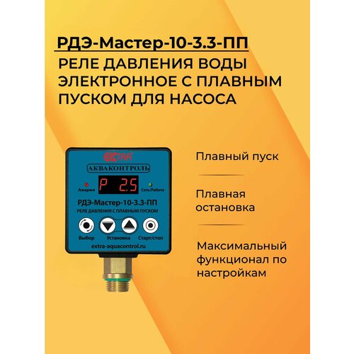 Реле давления с плавным пуском “EXTRA Акваконтроль” РДЭ-Мастер-10-3.3-ПП предназначено для автоматизации работы бытового электронасоса потребляемой мощностью P1 не более 3.3 кВт