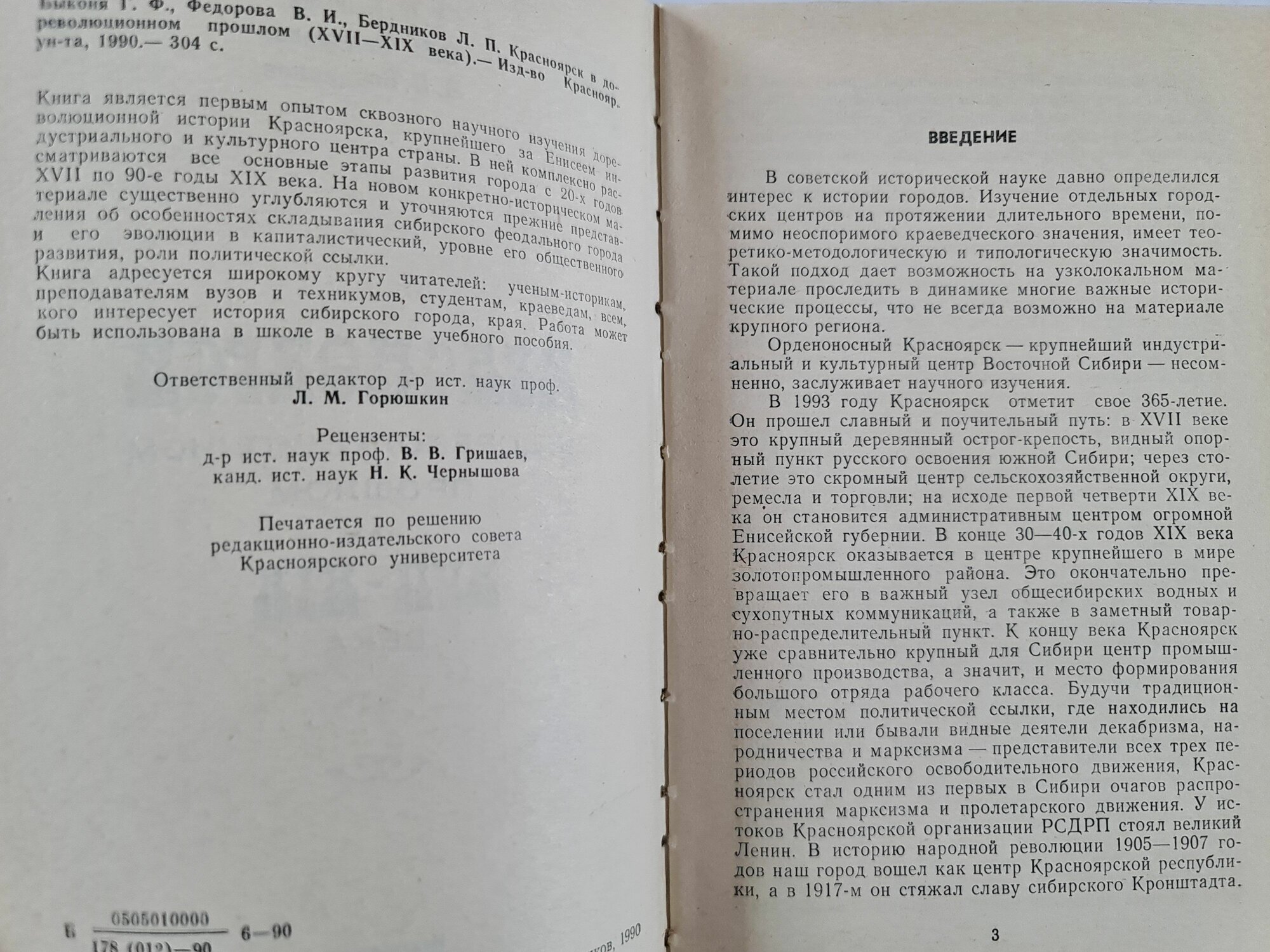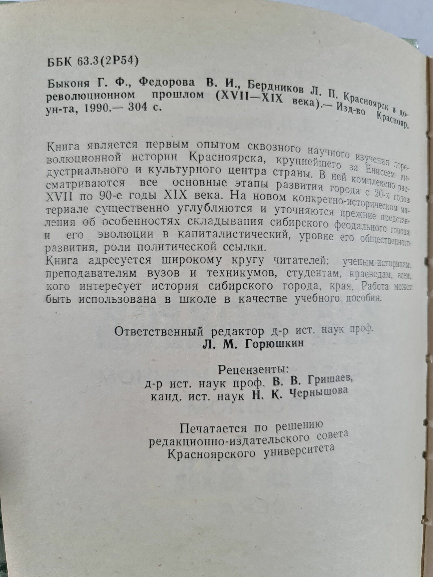 Редкая книга Г. Ф. Быконя, В. И. Федорова, Л. П. Бердников «Красноярск в дореволюционном прошлом (XVII-XIX века)», издание Красноярского университета, 1990 г.