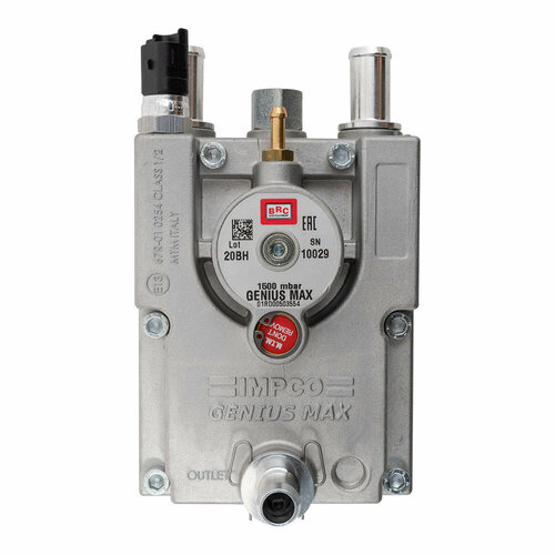 Редуктор BRC Genius MAX с темп. датчиком нового образца, обеспечивает точность и устойчивость значения давления во времени, низкое время отклика для лучшего отслеживания необходимых изменений мощности двигателя и благодаря высоким значениям расхода, подачу топлива в двигатели высокой мощности (до 240 кВт (326 л. с.); версия Genius Max). Конструкция одноступенчатого типа с мембранами. Регулируемое давление:150 kPa относительно давления впускного коллектора. Нет необходимости в действиях по экстренному сбросу газа Максимальная мощность питания с системой: 240 kW.(326 л. с.) Характеристики Сфера применения 4-е поколение пропан/бутан Характеристики Подача газа в редуктор 8 мм Выход газа 12 мм Подключение к системе охлаждения 16 мм Мощность 260 кВт Рабочее давление Рабочее давление на выходе 1.5 Бар