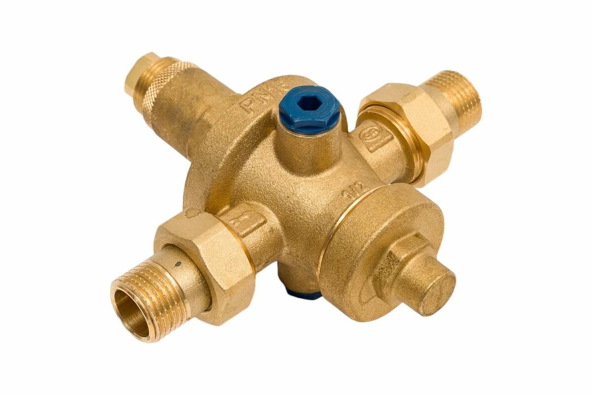 Принцип работы. Эластичная мембрана приводит в движение затвор в результате действия двух противоположных сил: снизу — давление воды в трубопроводе за редуктором (которое пытается закрыть клапан), сверху — воздействие пружины, заведенной с учетом рабочего давления, которое нужно поддерживать на требуемом уровне (пытается открыть клапан). Клапан открывается, когда, в результате выпуска воды через краны, снижается давление под мембраной и преобладает давление пружины; в тот момент степень открытия клапана пропорциональна расходу выпускаемой среды. По завершении слива, как только давление воды в нижней части трубопровода будет достаточным, чтобы противостоять давлению пружины, затвор поднимется, закрывая клапан. Регулировочное давление устанавливается путем завинчивания регулятора, который в той или иной степени сжимает пружину. Мембрана, приводящая в движение затвор, способна выдержать сильное противодавление на выходе, как пульсирующее (гидравлические удары), так и постоянное.