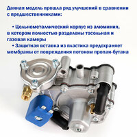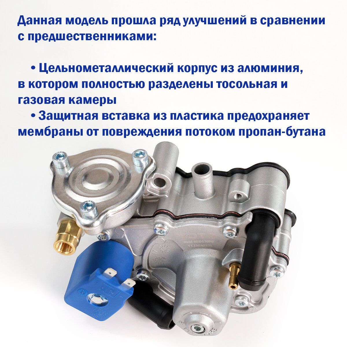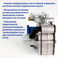 Стоит отметить, что в этом редукторе имеется усиленный шток клапана для защиты от механических примесей в топливе. Помимо всего, встроенный фильтр усилен армированной сеткой, которая хорошо защищает его от деформации. В редукторе имеются удобные патрубки для подключения тосольных и газовых шлангов.