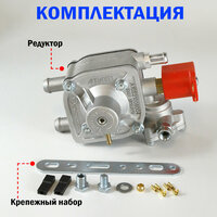 Вход газа в устройство рассчитан под пластиковую или медную магистраль с диаметром 6 миллиметров. Штуцер входа газа под гайку G1/4. Для подогрева редуктора имеется два пластиковых колена под тосольный рукав 16 мм. Выход газа осуществляется благодаря латунному штуцеру под шланг с внутренним диаметром 12 мм. Также на корпусе расположена регулировка выходящего давления под ключ шестигранник и вакуумный штуцер под рукав вакуумный 5 мм.