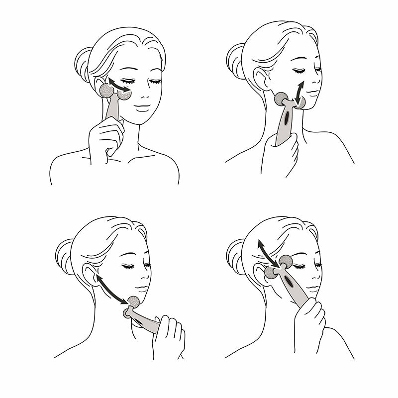 Деликатно прорабатывайте различные участки кожи, ослабляя или усиливая воздействие роллера. Для этого вам необходимо изменить угол наклона ручки. Массаж лица. 1. Начните со стимуляции лимфотока. Для этого проведите массажером по линии шеи от уха до ключицы. 2. Далее двигайтесь вперёд и назад вдоль линии подбородка. 3. Выполните массаж линии вдоль скул от уголков рта до ушей. 4. Мягко проведите массажером вверх-вниз между ртом и уголком носа. Для массажа области вокруг глаз используйте один ролик. 1. Разместите его у внутреннего уголка глаза и медленно прокатите его к виску, рисуя полукруги. 2. Медленно перекатывайте сферы по лбу в сторону макушки. Массаж шеи и зоны декольте. 1. Мягко проводите массажером вверх-вниз между ключицами и грудью. Рекомендованное время массажа 10-15 минут, начинать можно с 5-7 минут, постепенно увеличивая время.
