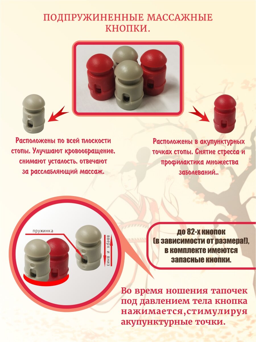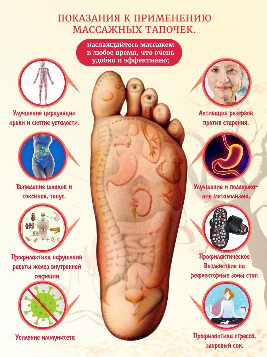 Рефлекторные массажные тапочки самый простой и доступный способ массаж ног в домашних условиях. Известно, что массаж акупунктурных точек способствует улучшению кровоснабжения, выведению токсичных продуктов обмена веществ, снятию стрессов и нервного напряжения. Ортопедические тапочки воздействуют на рефлекторные области стоп и нормализуют работу внутренних органов и систем. Домашнюю обувь с открытым носом легко регулировать по размеру, ведь тапочки шиацу имеют специальную липучку. Используйте тапочки массажные ортопедические не более 30 минут в день. Массажные медицинские тапочки можно носить дома и на улице. Женские и мужские тапки для взрослых нельзя стирать в горячей воде и в машинке. Закажите, домашние тапочки массажные для себя или в подарок близким.