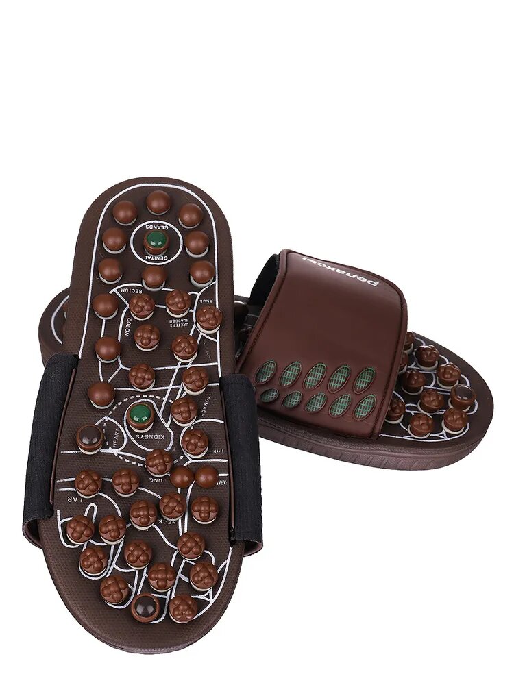 Тапочки снабжены множеством подпружиненных массажных элементов в виде кнопок разной формы, которые имеют различное массажное усилие для создания максимально комфортного массажа стопы. Подпружиненные кнопки установлены в винтовых направляющих и при вдавливании прокручиваются, увеличивая массажное воздействие. Массажные тапочки помогут, получить рефлекторный массаж ног и избавят вас от отечности, тяжести и боли в ногах. Вы можете носить массажные тапочки как дома, так и на улице и получать полноценный массаж когда вам это необходимо. Во время первого применения массажных тапочек вы можете почувствовать незначительную боль, но это лишь подтверждает эффективность массажа стоп. На каждом тапочке располагается 41 массажный элемент. Расположение этих элементов обусловлено различным давлением на разные зоны стоп. Рекомендуется носить по 15-20 минут 1-2 раза в день. Преимущества: - Регулируемая застежка-липучка - Особое расположение массажеров по точкам Вашей стопы - Отличная амортизация стопы - Износостойкая противоскользящая подошва - Модель унисекс подойдет как мужчинам, так и женщинам - Удобный размерный ряд и универсальный цвет. Размер: S- 26,5 M-27,5 см. L- 29 см. Материал: Подошва-ПВХ Верхняя союзка- экокожа.