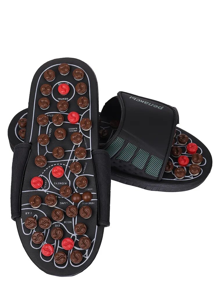 Рефлекторные массажные тапочки с вращающимися подпружиненными массажными элементами подходят для любой ширине стопы. Массаж стоп выполняется пружинящими головками, которые при надавливании проворачивается вокруг собственной оси, трение вызывает дополнительное тепло, которое усиливает эффективность воздействия массажа шиацу. Регулярный массаж стоп может продлить жизнь благодаря гармонизации тела, функции которого действительно улучшаются. Состав: ПВХ, ПНД. Размер: S-(36-38), M-(39-41), L-(42-44). Материал: Подошва-ПВХ Верхняя союзка- экокожа