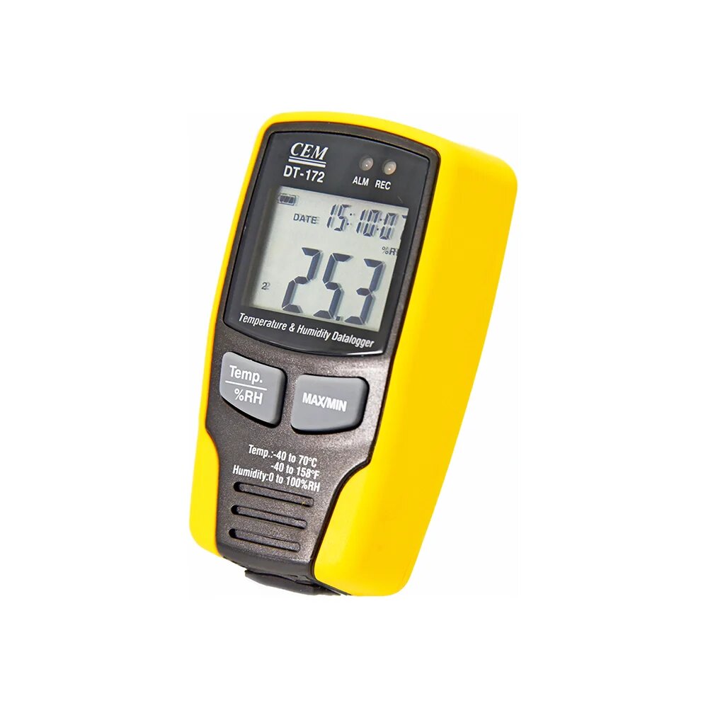 Регистратор температуры и влажности СЕМ DT-172 480298 весит всего 80 г, благодаря чему без труда транспортируется в кармане брюк или куртки. Модель позволяет сохранять до 32700 записей во внутренней памяти. Прибор улавливает изменения температуры на 0.1 градуса и влажности на 0.1%. В случае выхода значений температуры и влажности за заданные пределы срабатывает светодиодная индикация. Передача снятых показаний на ПК осуществляется через USB-разъем.